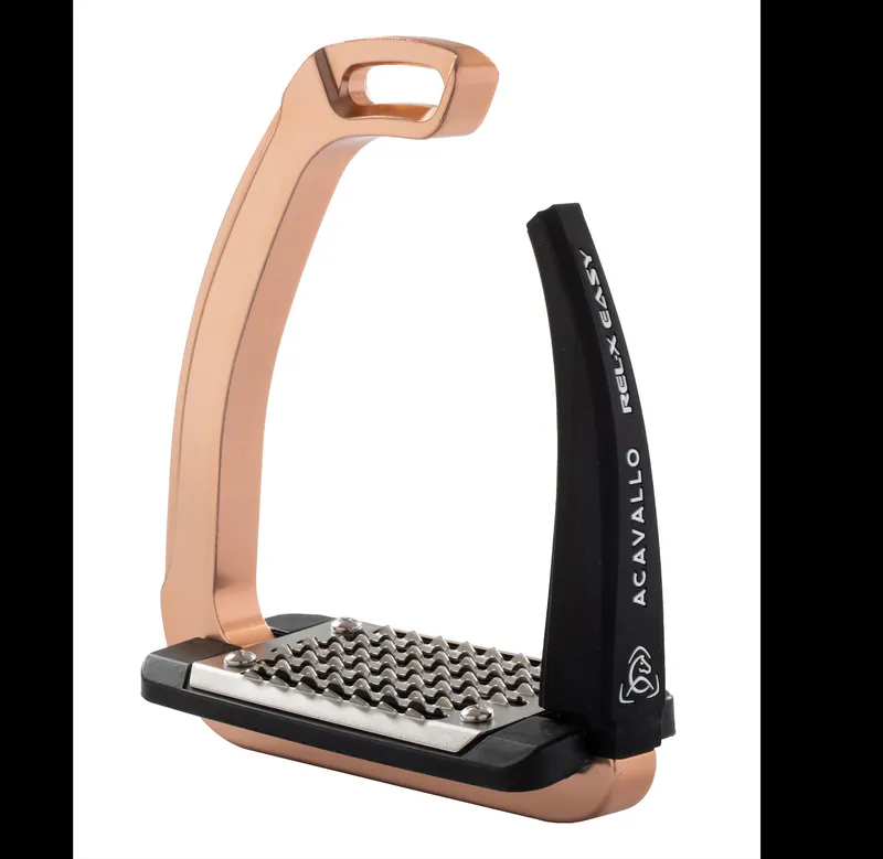 Acavallo® stirrups with innovative lateral opening branch in flexible silicone for easy release in all directions in the event of a fall or strong pressure exerted by the rider's foot.