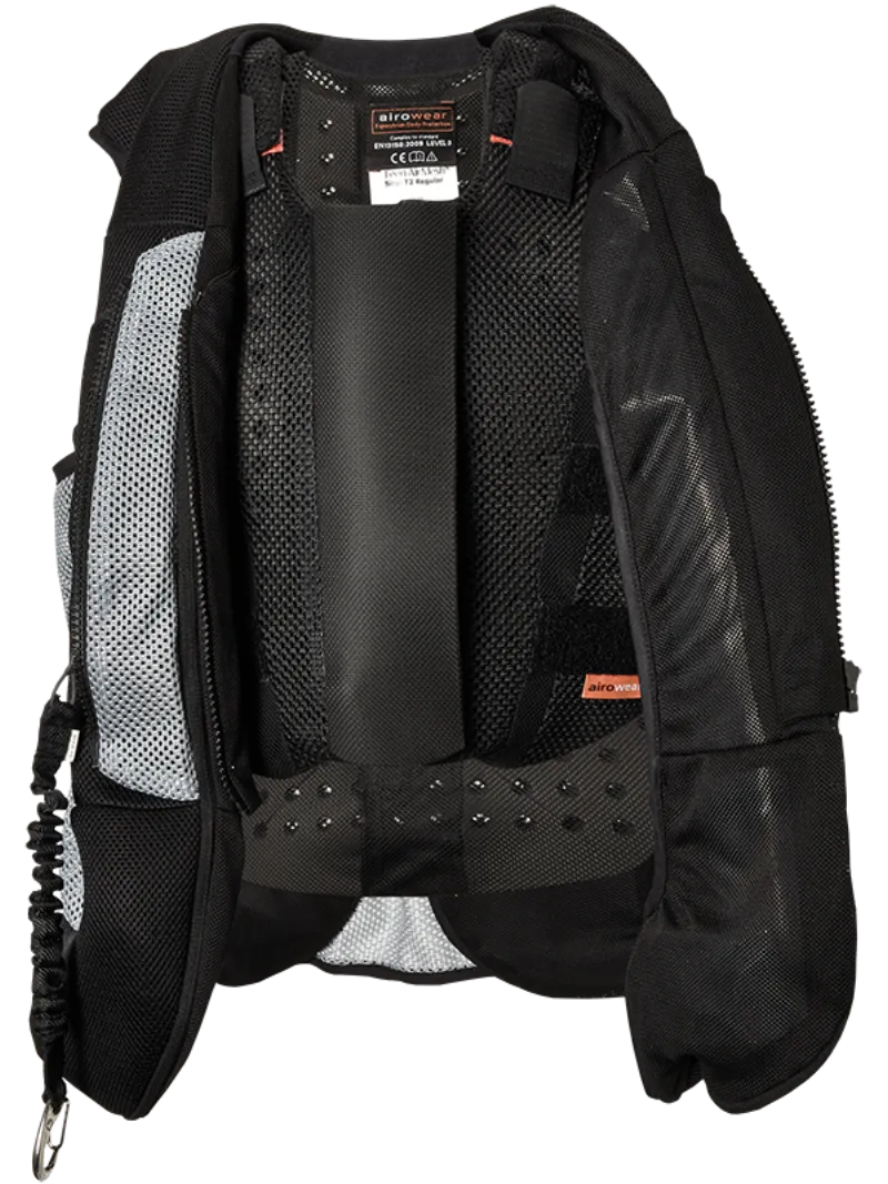 The AyrPS unites a detachable, inflatable AirShell gilet tested to Satra M38:Issue 3 February 2015 airvest standard with the lightweight BETA 2018 Level 3 AirMesh2 body protector. Together they offer the most highly ventilated, double layer protection in Airowear’s line. Both layers have breathable mesh covering for optimization of airflow. With a wide range of gender-specific sizes, the AyrPS fits comfortably and moves with the rider’s body. It is available in black with silver.