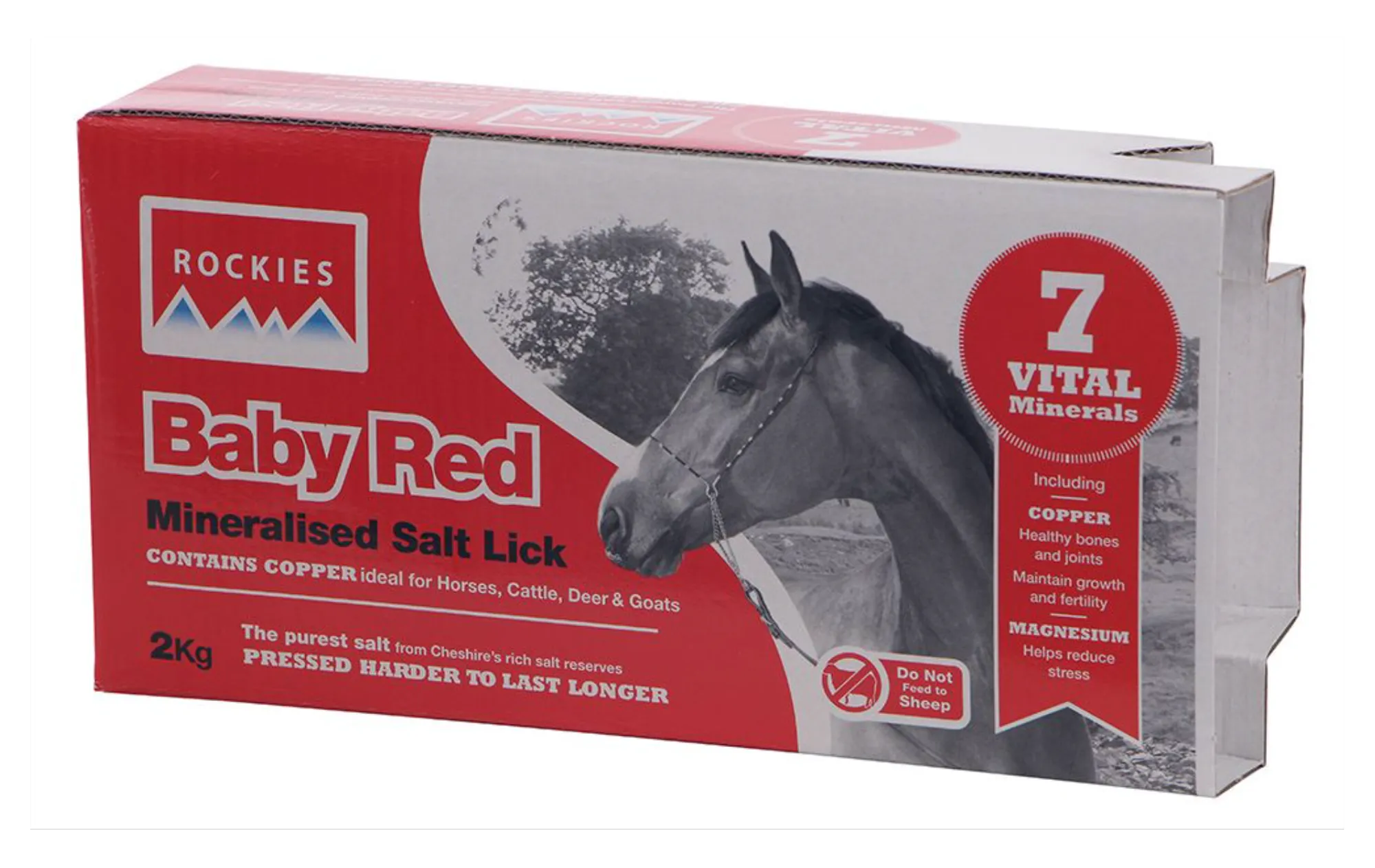 Baby Red Rockies are mineralised salt licks with seven vital minerals, including extra copper for bone and joint health, growth and fertility; and magnesium to aid in stress reduction. Like all Rockies products, Baby Red salt licks are made from Cheshire salt, considered one of the purest and tastiest in the world. Horses and ponies really do prefer them! Their exceptional hardness also means they last longer and are therefore better value for money than alternatives.