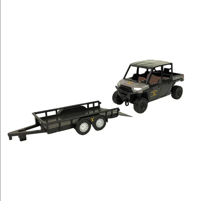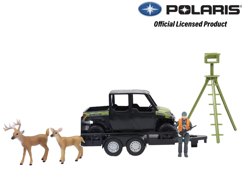 This toy is perfect for kids who love to hunt! Our Polaris Ranger® features a front winch and a tailgate that opens and dumps. The ATV trailer features a tailgate, trailer jack, and peg hitch to connect to the Big Country Toys Ford® F250 Super Duty truck. (Sold Separately) The hunter can drive his Polaris Ranger to his stand, make the climb up, and sit on his chair as he waits for the deer. After he is done for the day, he can load up his Ranger onto his trailer and head home!