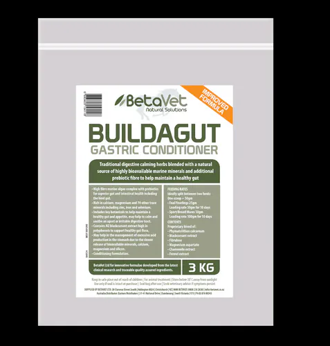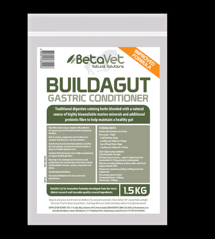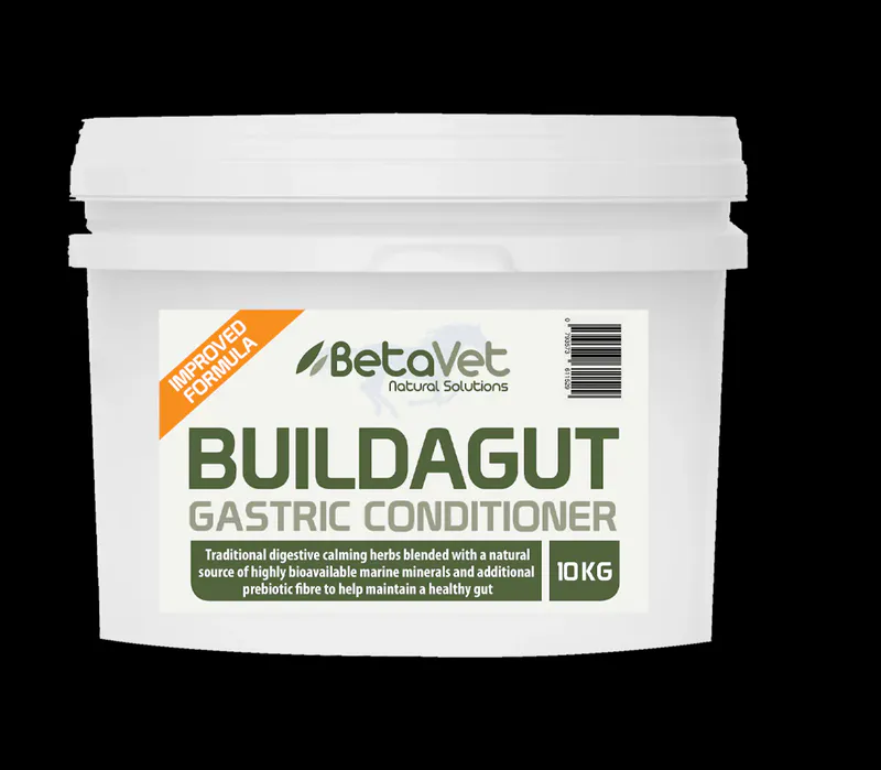BUILDAGUT contains traditional digestive calming and healing herbs blended with a natural source of highly bioavailable minerals and balanced with additional fibre plus blackcurrant extract rich in polyphenols providing excellent prebiotic action. The perfect blend to calm, restore and enhance the digestive tract and feed efficiency.