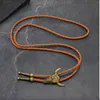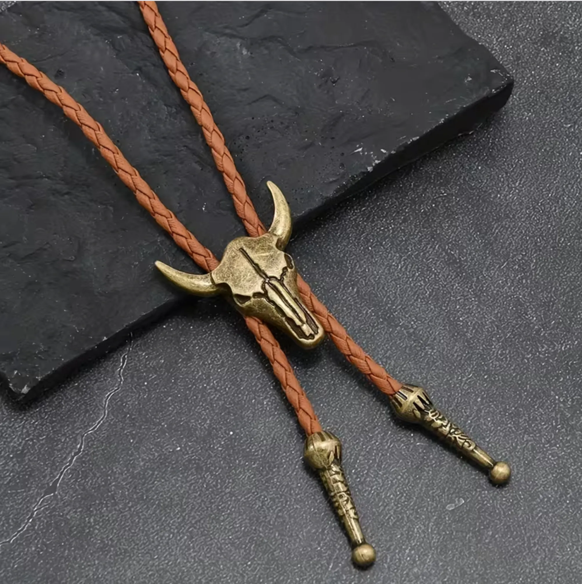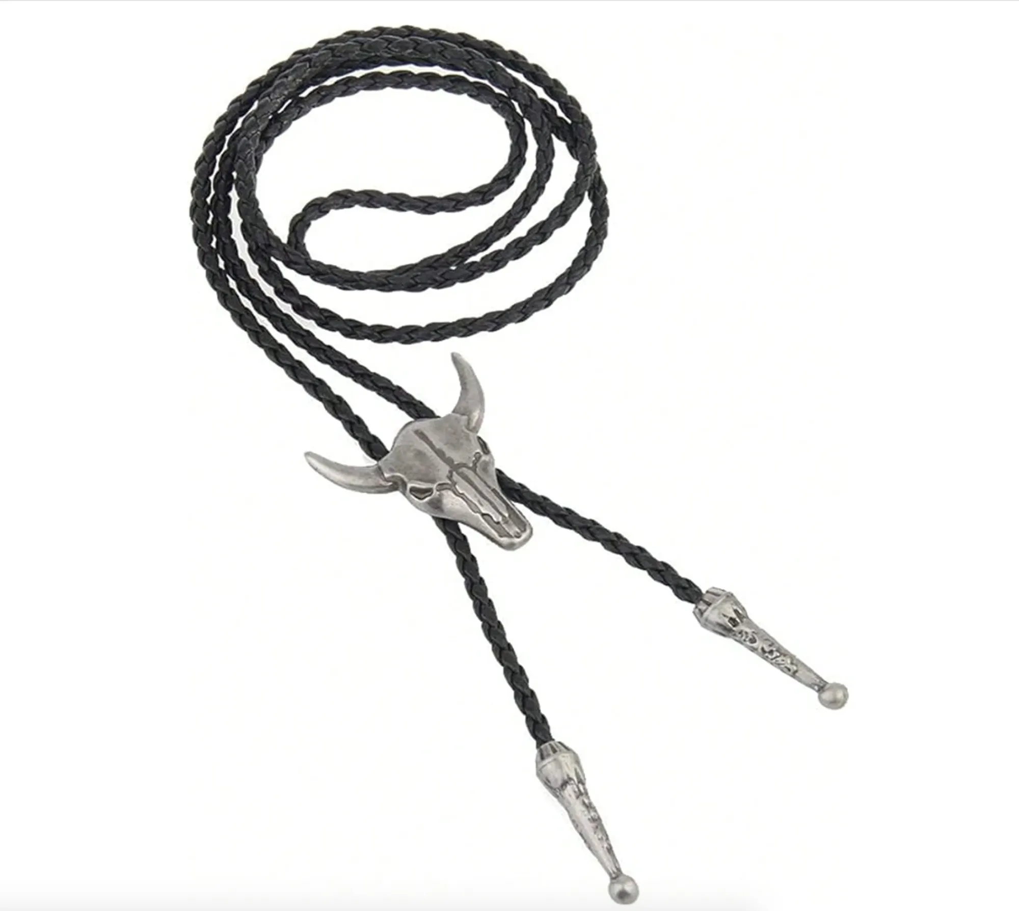 A bolo tie is a type of necktie consisting of a piece of cord or braided leather with decorative metal tips and secured with an ornamental clasp or slide.