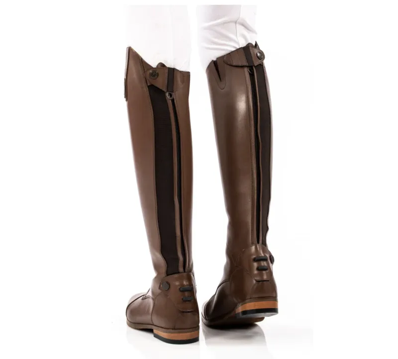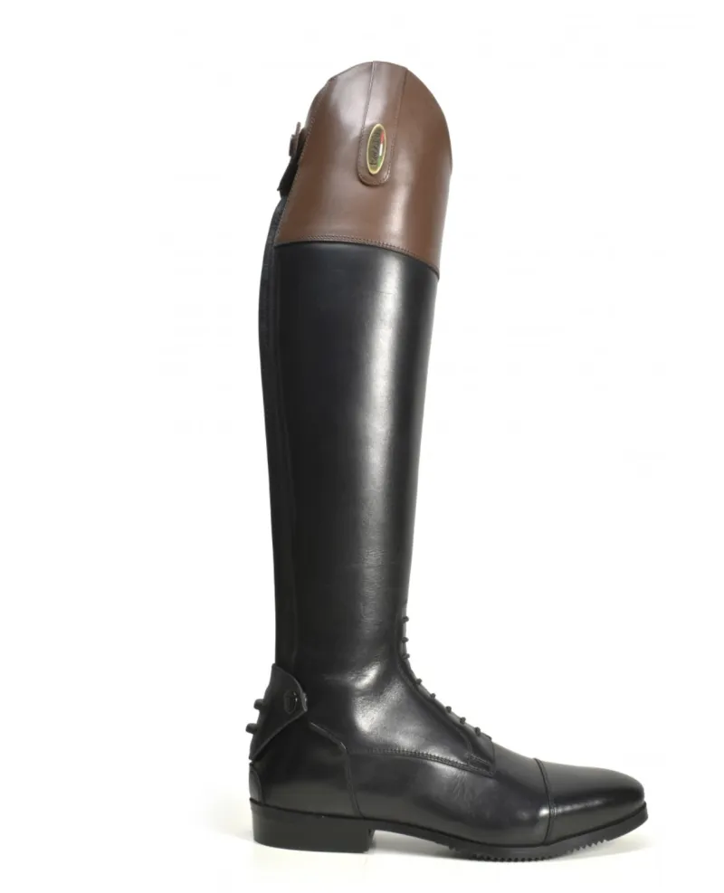 Luxury leather competition boot with field style foot and mock elastic laces, made from high-grade leather, improved fit around ankle, multi-level spur rest and cover, elastic zip cover at back of knee with hidden zip holder, full leather lined, full length rear zip with elastic panel.