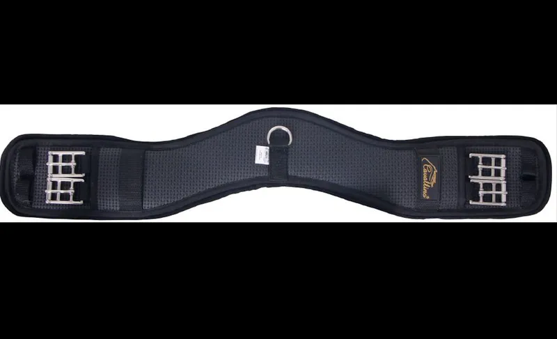 This Girth allows more freedom from the shoulders and increased comfort. Anti-Slip, breathable AirTech backing removeable for easy cleaning Double buckle with double end elastic. Stainless steel fittings.