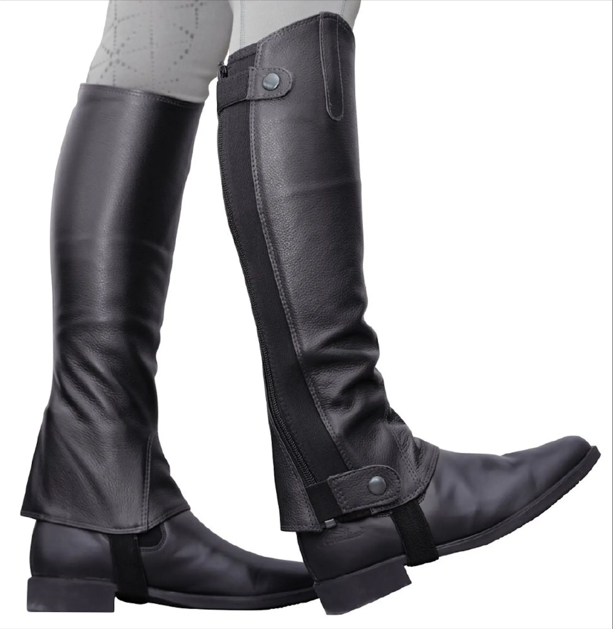 Crafted for serious riders, these premium leather chaps deliver a sleek, competition-ready look with exceptional comfort and durability. Made from high-quality leather, they provide a close fit that enhances leg contact and stability in the saddle. The elasticated panel ensures flexibility and a secure fit. These chaps combine classic style with practical performance for training or show days.