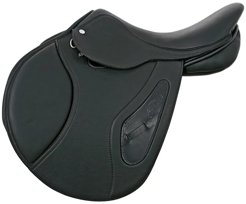 This saddle has a medium flat seat with knee rolls and a thigh blocks for security. The flaps are calf skin covered and the panel is flock filled. Colours Black, Brown
