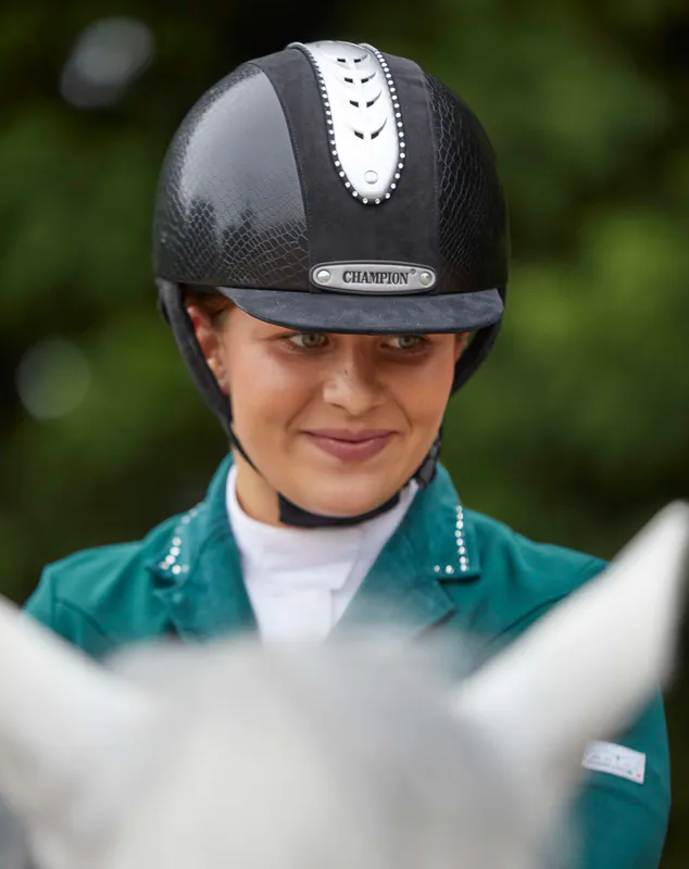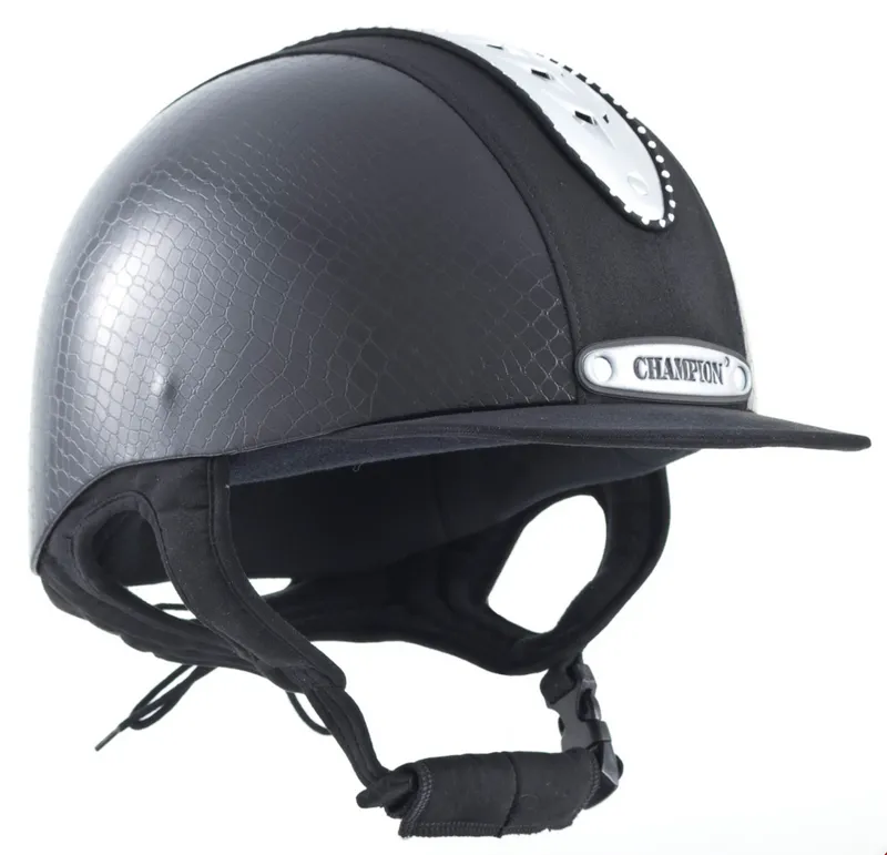 The Champion Evolution Couture helmet features genuine Swarovski ® crystals and a striking synthetic crocodile skin finish, for a high impact look you will love.