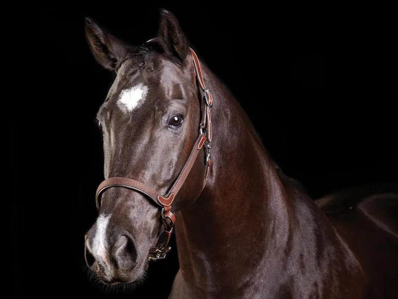 Stylish leather headcollar with leather padding under the nose, crown and cheek straps for added comfort