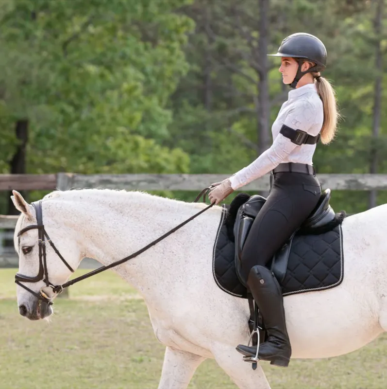 Tired of your trainer yelling at you to get your shoulders back? Our newest product is an adjustable and elastic Position Reminder that improves your posture, riding, and connection with the horse. The Position Reminder takes the place of that old trainer trick of the whip behind your back, which leads to an uncomfortable over-correction.