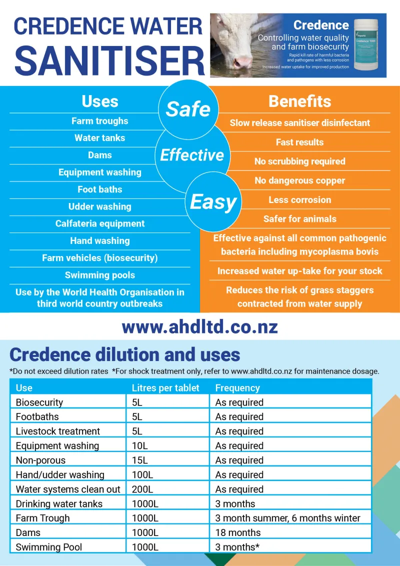 Credence is the ideal solution for treating stock and household drinking water, cleaning livestock housing, sheds and facilities including feeding equipment. The Credence tablet is simply added to stock dams, water troughs and directly into water holding tanks.