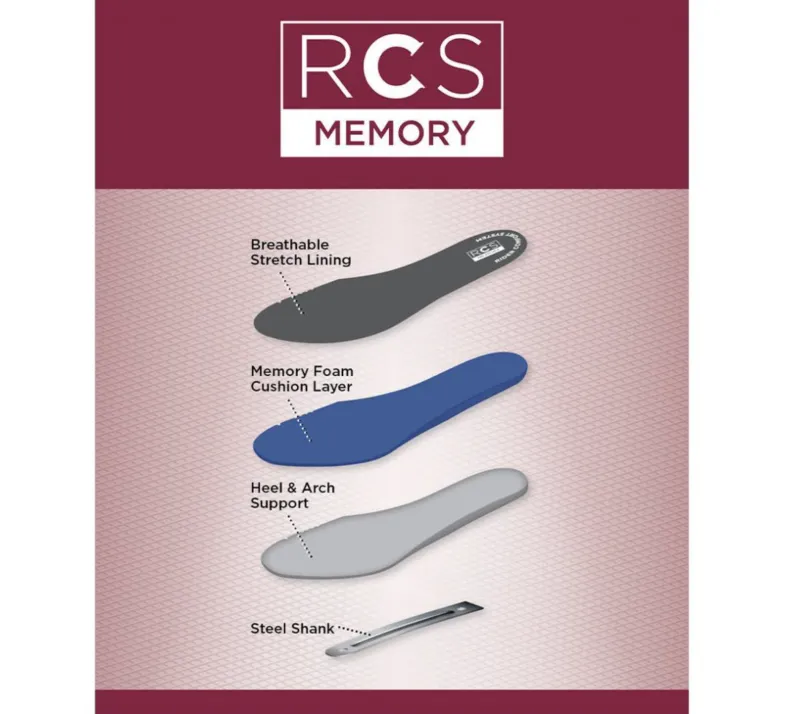 The RCS Memory footbed offers a memory foam cushion layer, for ultimate comfort and support. Features padded shock absorbing cushion, heel and arch support & breathable stretch lining to keep your feet cool and dry.