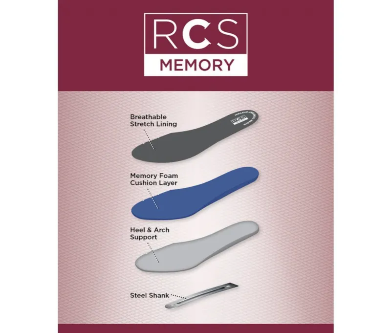 The RCS Memory footbed offers a memory foam cushion layer, for ultimate comfort and support. Features padded shock absorbing cushion, heel and arch support & breathable stretch lining to keep your feet cool and dry.