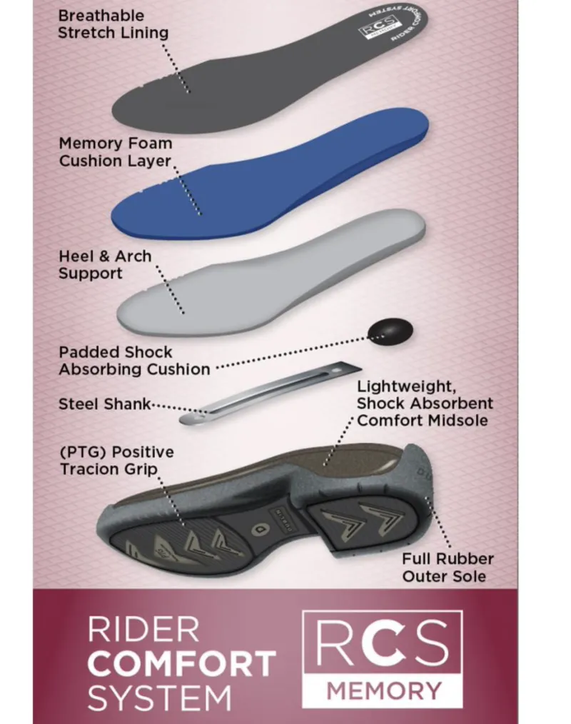 The RCS Memory footbed offers a memory foam cushion layer, for ultimate comfort and support. Features padded shock absorbing cushion, heel and arch support & breathable stretch lining to keep your feet cool and dry.
