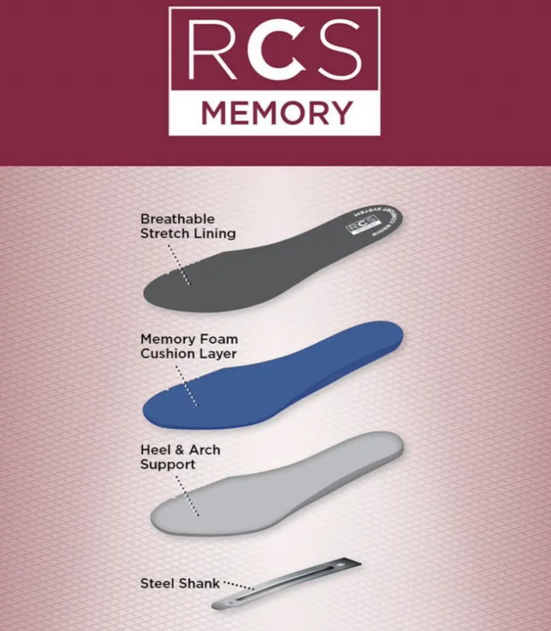 RCS Memory footbed system, offers a memory foam cushion layer, for ultimate comfort and support. Features padded shock absorbing cushion heel and arch support and breathable stretch lining to keep feet cool and dry.