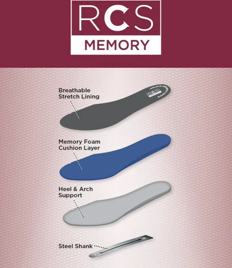 RCS Memory footbed system, offers a memory foam cushion layer, for ultimate comfort and support. Features padded shock absorbing cushion heel and arch support and breathable stretch lining to keep feet cool and dry.