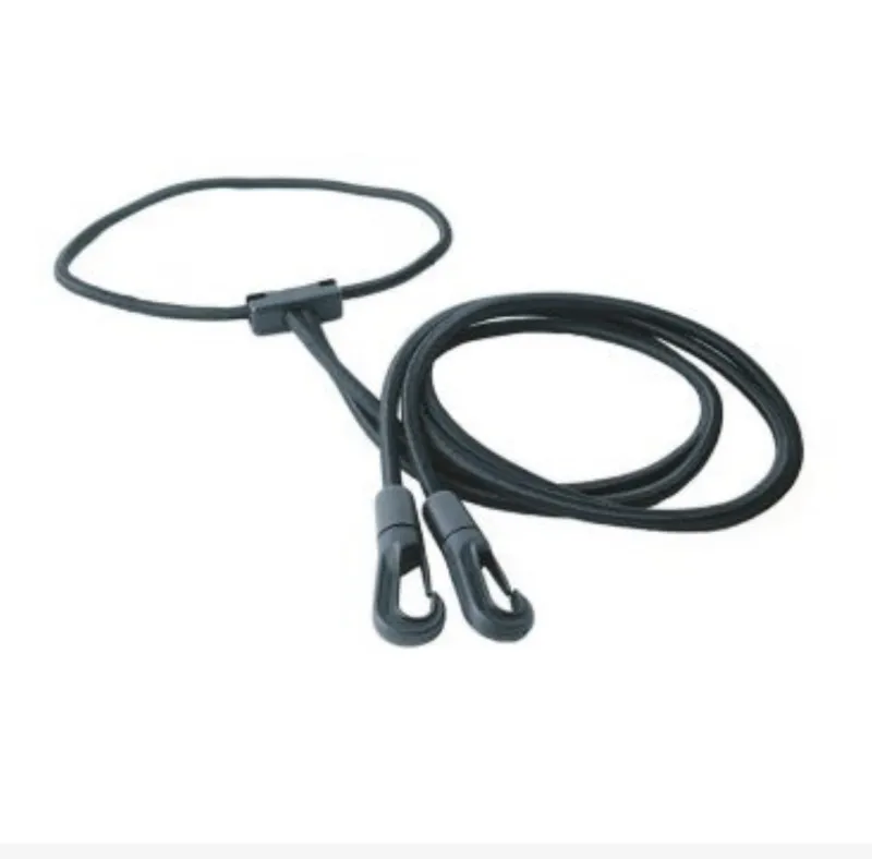 The single length of elastic is passed over the poll and through the bit rings. It is then either passed through the horse's legs and attached to the girth, OR on either side of the horse to the saddle or lunge roller (as pictured here).