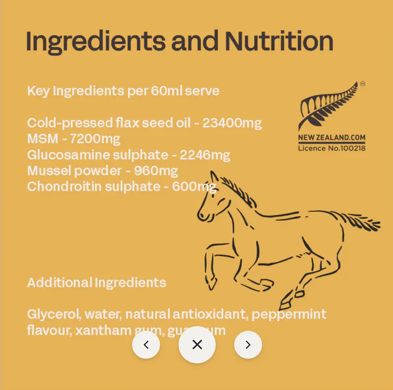 100% natural cold-pressed flax seed oil, glycerol, water, MSM, glucosamine sulphate, green lipped mussel powder, chondroitin sulphate, peppermint flavour, natural antioxidant,