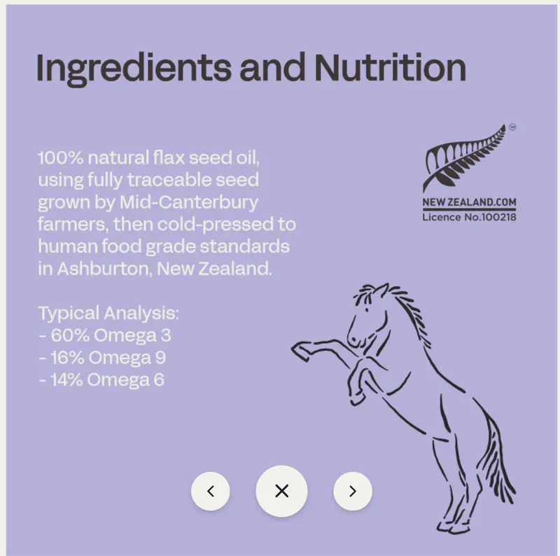 Our flax seed oil naturally contains over 60% Omega 3, much higher than any other fish or plant oils. Flax seed oil is a great source of cool energy, ideal for horses in work. High levels of Omega 3 promote quicker muscle recovery after exercise. This oil brings fantastic everyday benefits for your horse’s skin, coat, joints and heart health.