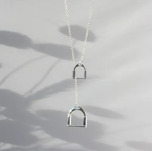 The Breeze Double Stirrup Necklace is a very modern piece of equestrian inspired jewellery. The necklace length is 45cm in length, so this necklace is short and sits on the chest. Adjust the two stirrups to have them sit as you would like. This necklace is made from sterling silver.