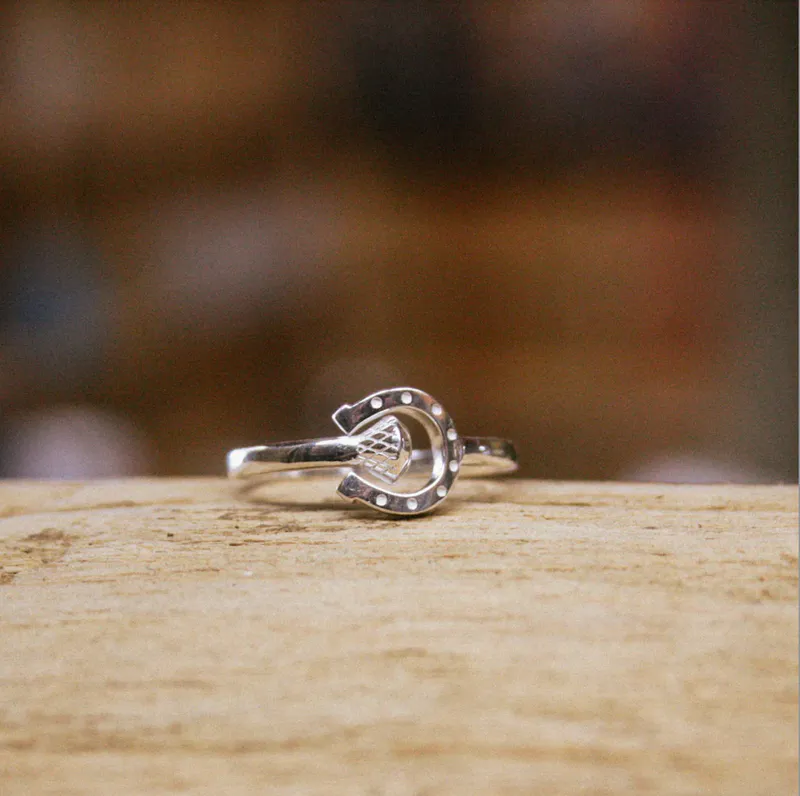 This ring is crafted from sterling silver and features a horseshoe and a nail at either end of the silver shank. The horseshoe and nail design come together to create a total wrap. This gives a very unique and modern look. The ring is available in 3 sizes, 7, 8 & 9 (small, medium, large). This is a perfect, everyday piece of equestrian jewellery.