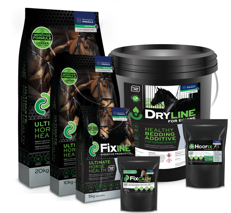 We have a product called Fixine. It is a blend of live probiotics Lactobacillus Casei, Lactobacillus Acidophilus, Lactobacillus Plantarum, Enteroccous Faecium, Bacillus Subtillis, Bacillus Amyloliquefaciens, Saccharomyces cerevisiae and we use NZ organic mineral clay as a base. Mineral clays, have a gut pH buffering effect as well as reduce the negative impact of nematode (worm) infections in young animals. Such beneficial effects of mineral clays are very complimentary to those of probiotics and it is likely the combination of the two supplements convey enhanced benefits to horse welfare and performance.