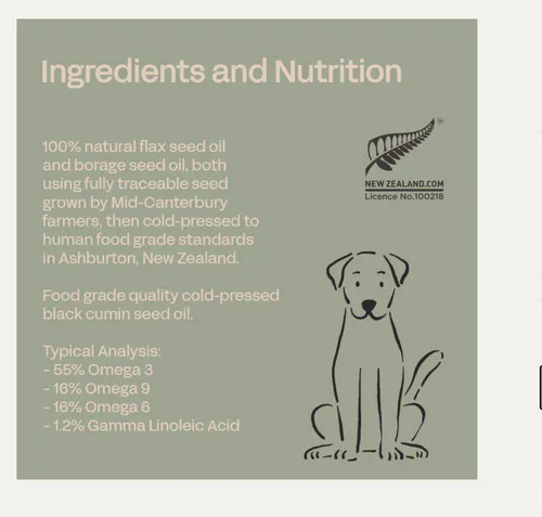 100% natural cold-pressed flax seed oil, borage seed oil and black cumin seed oil.