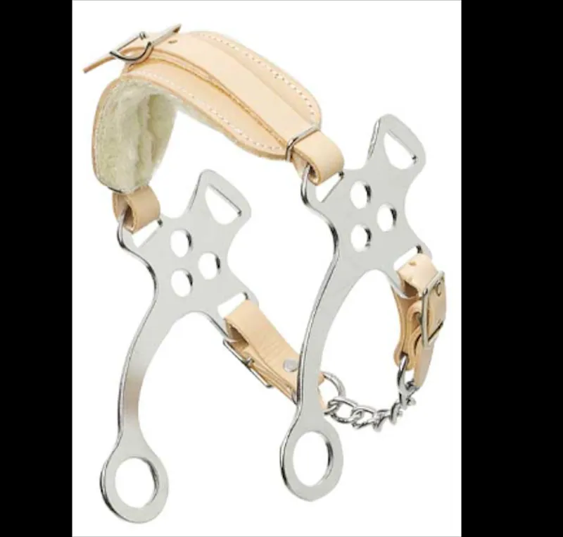 Chrome plated with fleece lined leather nosepiece and curb chain. This is a Blair's Pattern mechanical hackamore that operates on a leverage system to exert poll, nose and curb pressure. There is no mouthpiece.