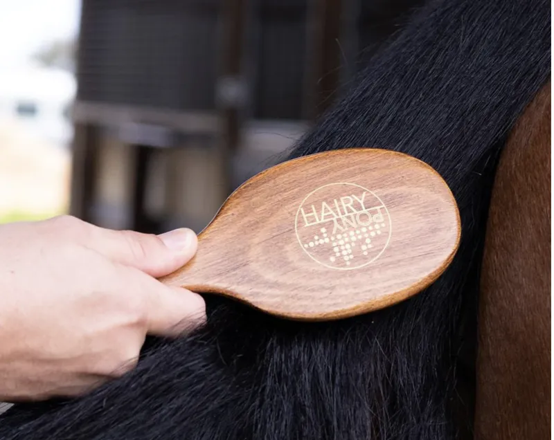Our HAIRY PONY MANE & TAIL BRUSH is the ultimate brush for mane & tail care. Smooth metal bristles minimise hair breakage when brushing out stubborn knots. The ergonomic hand-crafted beechwood handle ensures a secure pad & bristles, as well as being comfortable, easy to grip and a beautiful addition to your grooming kit.