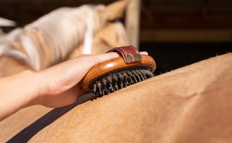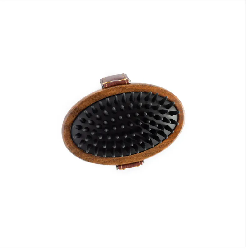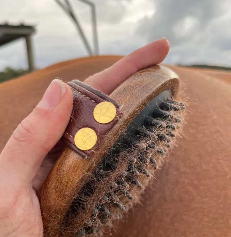 No more sore hands rubbing out coats with this rubber horse brush! Perfectly shaped to fit in your palm, with a soft padded handle. Handcrafted with our signature beechwood, the HAIRY PONY RUBBER BRUSH makes removing shedding hair quick & easy on long and short coats! Loose hairs are gently & efficiently removed with durable yet flexible rubber bristles that grab onto the coat whilst massaging the horse. The HAIRY PONY RUBBER BRUSH is finished with a comfortable paddle handle & beautiful gold details - another timeless addition to your grooming collection. This rubber horse brush gives your horse a massage at the same time, it will be your horse's favourite brush!