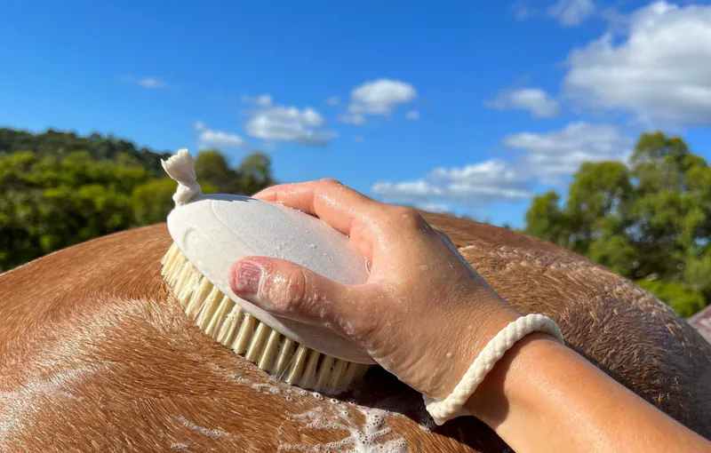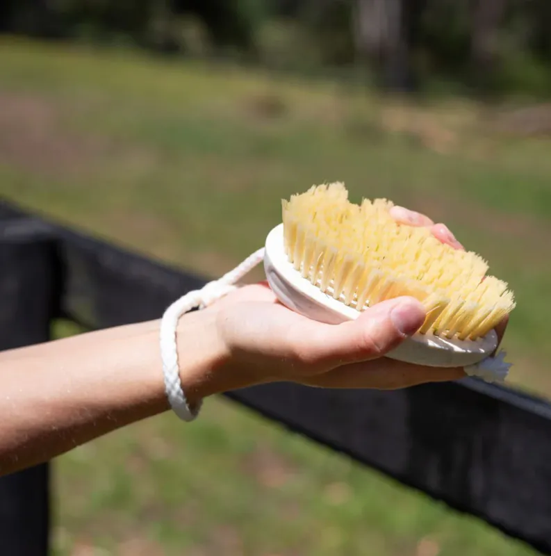 Firmer than a sponge yet still flexible, the HAIRY PONY WASH BAY BRUSH'S natural cactus fiber bristles offer a gentle, deep cleanse of your horse's coat & skin. The bristles are securely packed in to the handle, which is made using cutting-edge technology that transforms wheat farming waste in to a durable, waterproof material.