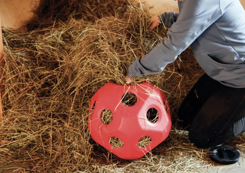 Fill this ball up with a bit of loose hay and your horses or ponies will be amused for hours. This durable UV-resistent ball is 40cm in diameter and will hold up to 3kg of loose hay. Nineteen 7cm diameter food openings ensure sufficient food supply. 1.7kg empty weight.