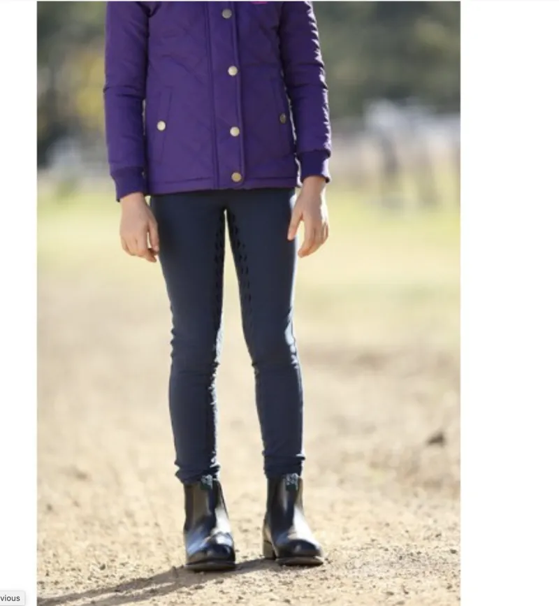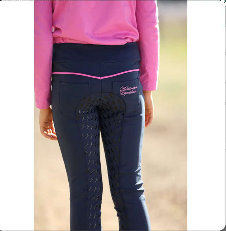 • Huntington Girls Pull On Breeches feature a full gel seat, contrast piping, and logo embroidery.