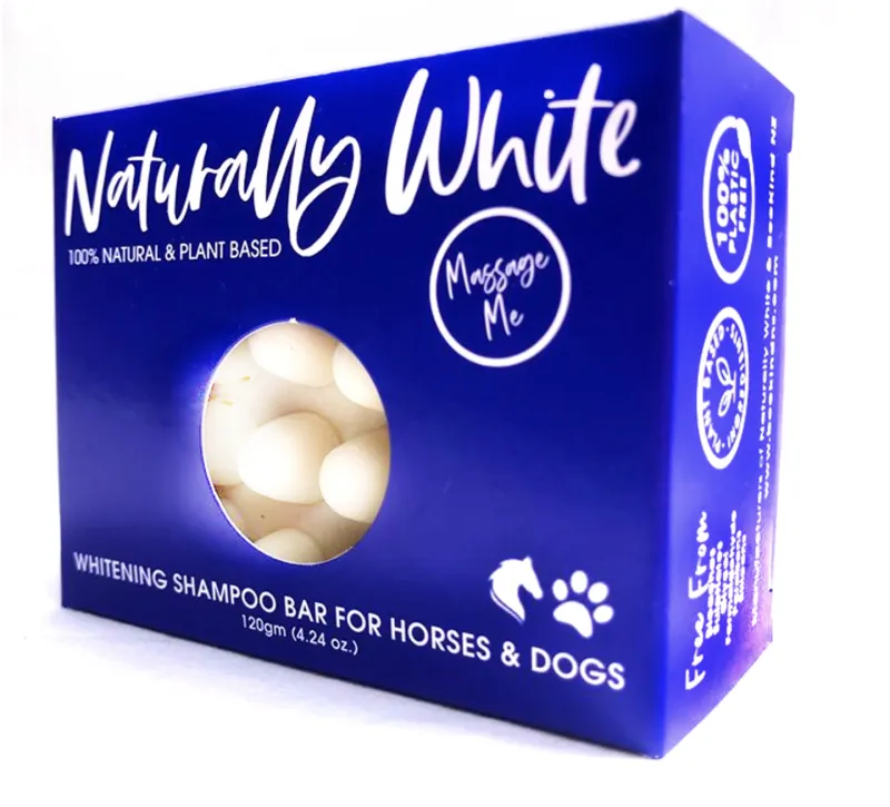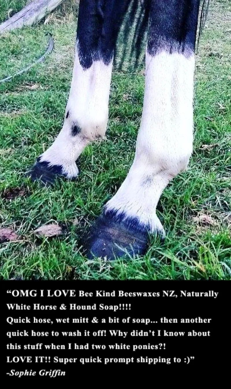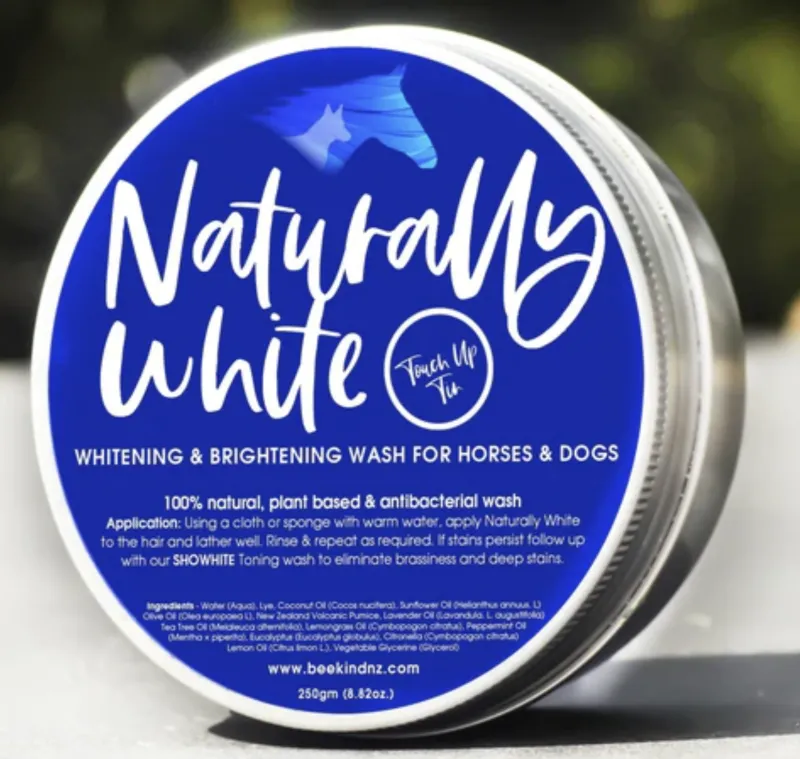 300gram In a Tin Or 110Gram Soap Bar (shrink wrapped with Label) Our Naturally White Soap Wash For Horses & Hounds - Is Lovingly hand made and is 100% natural. The base plant oils are sunflower oil, olive oil and coconut oil with added finely ground NZ organic volcanic pumice and gold certified essential plant oils. We do not use chemicals, alcohol or preservatives. Due to the soaps high pH balance we do not have to add in chemical preservatives. We also lovingly make these soaps in small quality batches by hand and not by machines! So there is no problem with shelf life or cheap undisclosed commercial ingredients. Horse Soap, dog soap, wash bar, horse shampoo, dog shampoo, natural dog soap, pet soapOur new soap in a rust free tin is very handy, still being a natural hand made soap wash. We received a lot of amazing feedback from riders using this soap in a tin in comparison to soap bars. This soap Lathers up exceptionally well and doesn't break down like a bar. This beautiful soap for horses and dogs, also eliminates endless rinsing of bubbles and doesn't strip natural oils as synthetic commercial soaps tend to do. Usually a soap bar gets left in the bucket or you have to find a container for your soggy used bar. This soap in a tin is a clever way of washing your horse for spot cleaning or full washing. Once used, you can place the lid back on without your lovely bar turning to mush. Very handy for your grooming gear kit and easy use for traveling and staying away. Great too for spot cleaning on white legs. All you need is a spray bottle with water, dampen sponge and the lid can straight back on. Lasts longer, less wastage! The sponge fits perfectly within the tin, but you can also use a rag, brush or grooming mitt, all with ease. The bonus of this soap in a tin, is that it will last much longer than shampoos and bars without the nasty chemicals.