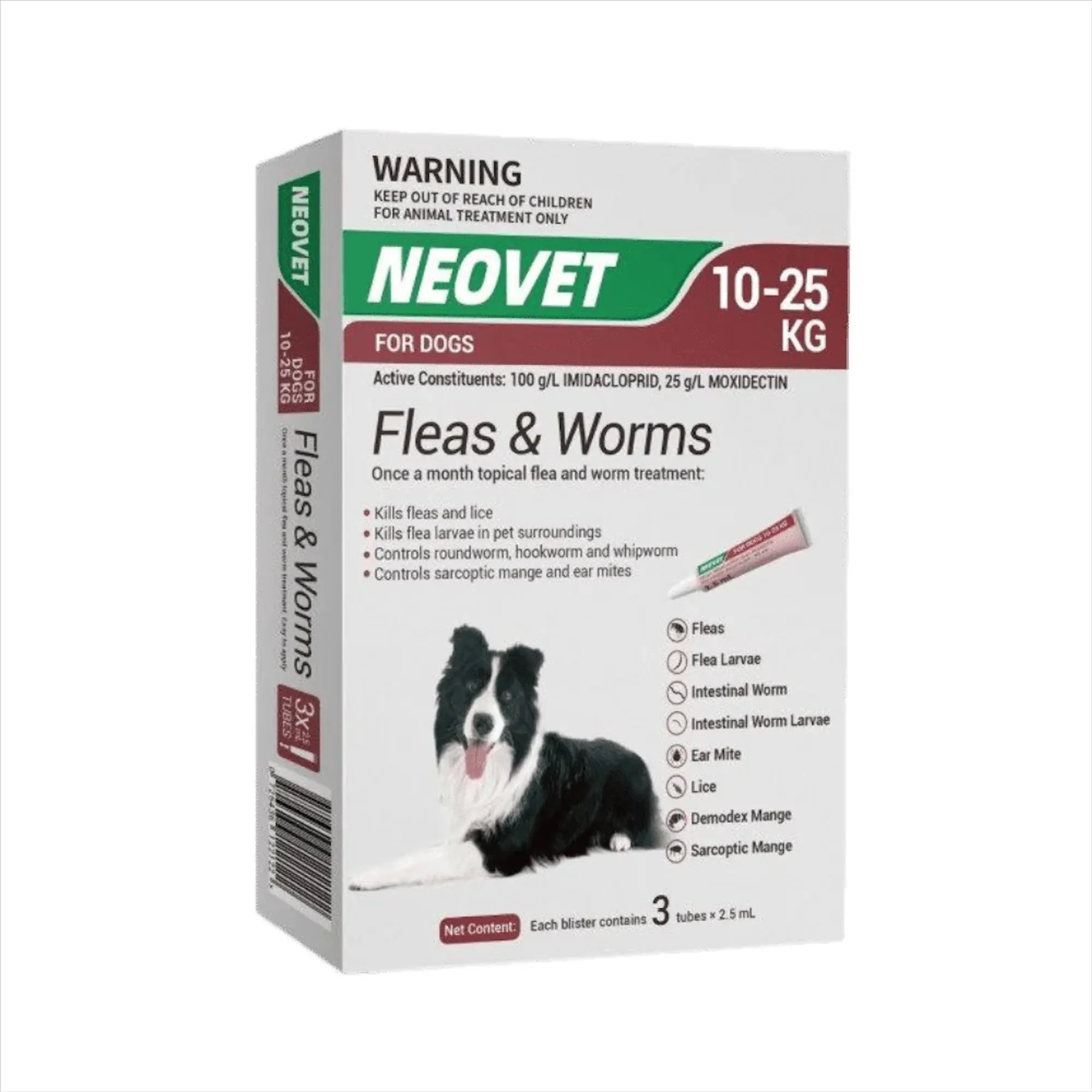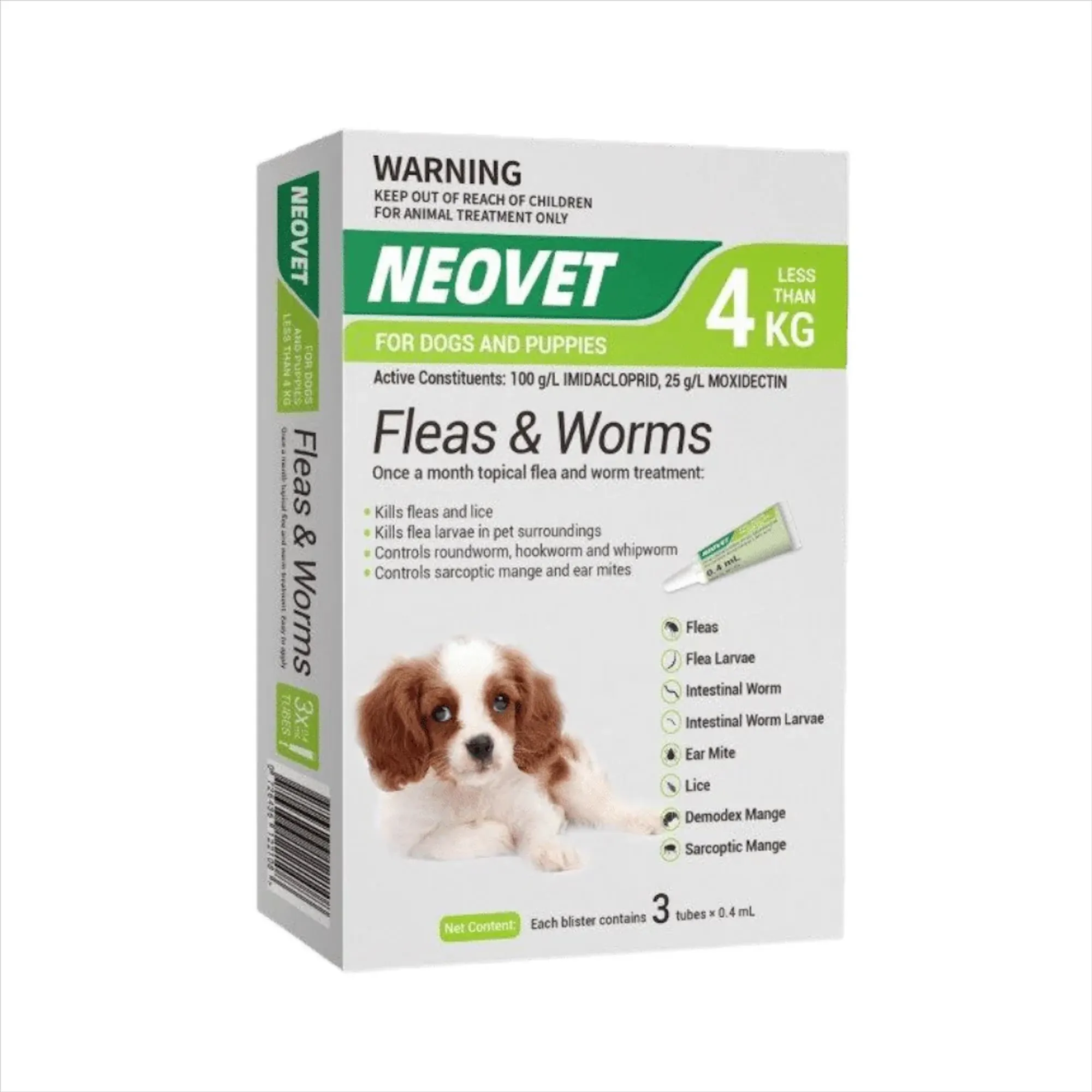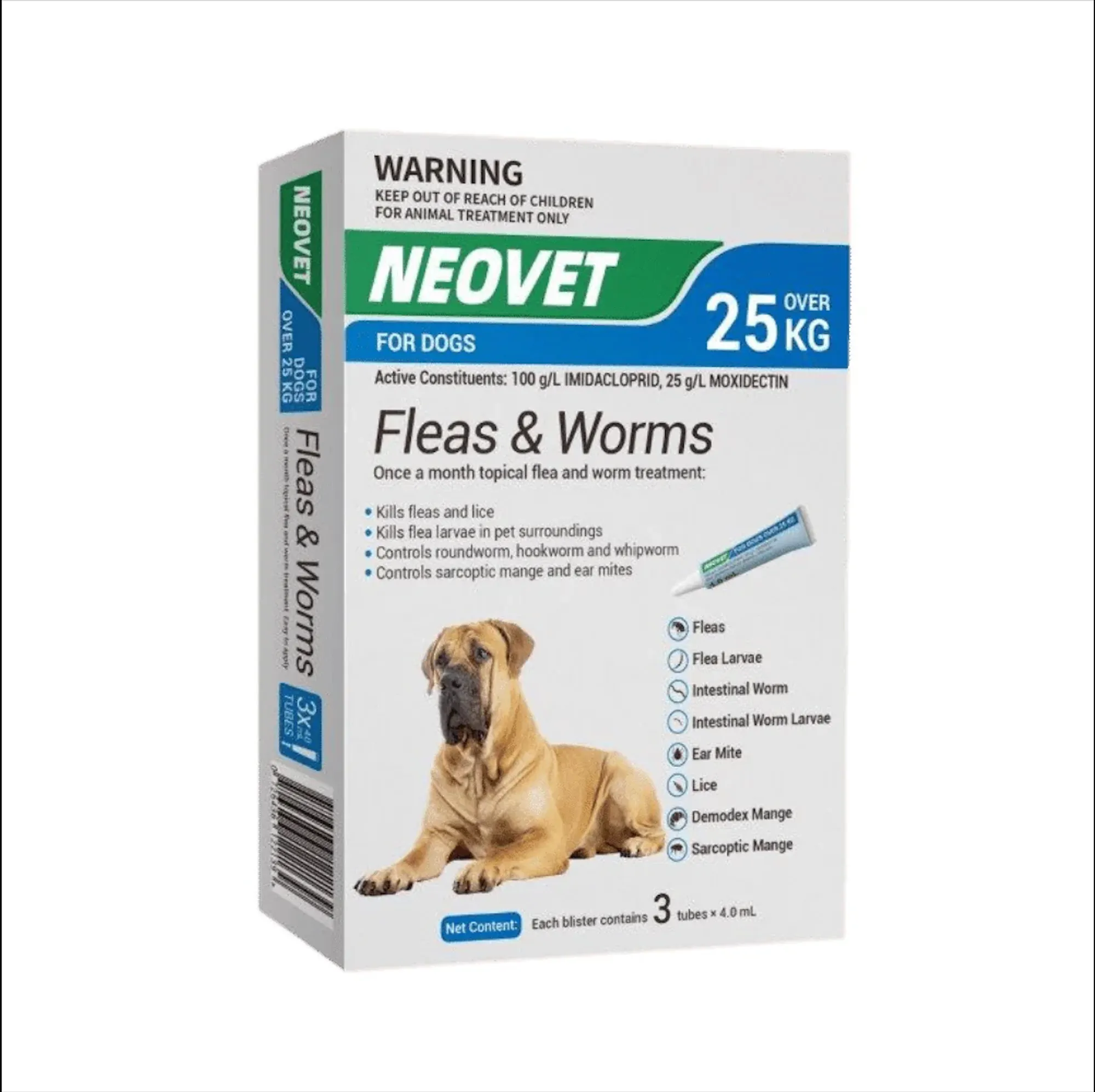 Neovet for Dogs is a monthly topical treatment formulated with imidacloprid and moxidectin (same active ingredients as Advocate), designed to safeguard your canine companion against a range of parasites. Suitable for dogs and puppies from 7 weeks of age, Neovet offers a convenient and effective solution to keep your pet healthy and comfortable.