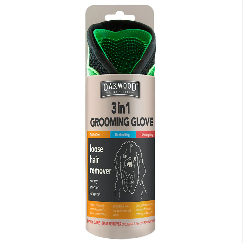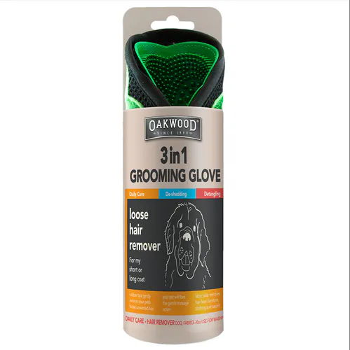 The Oakwood pet grooming glove removes loose hair as it massages the coat, improving manageability and shine.