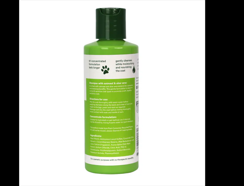Oakwood Gentle Shampoo with Oatmeal & Aloe Vera is a soap free shampoo that moisturises coat to promote a healthy clean wash. Formulated to pH balanced levels to improve coat healthiness, long-term performance and shine. Also provides a long-lasting Oatmeal & Aloe Vera after fragrance to your pet’s coat.