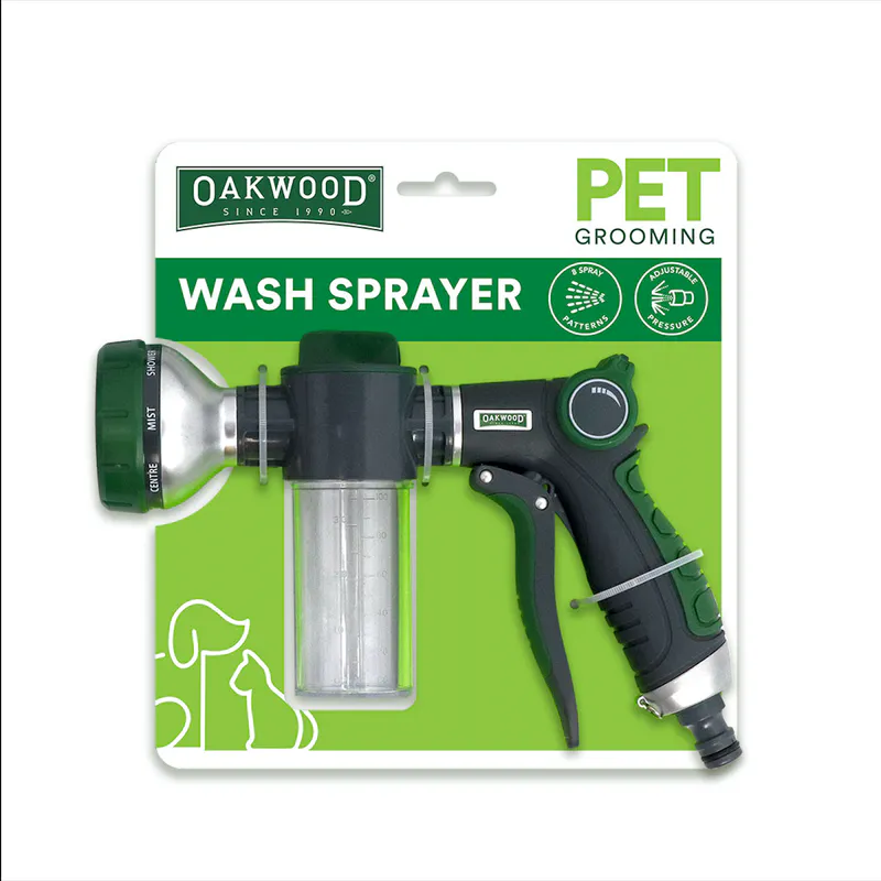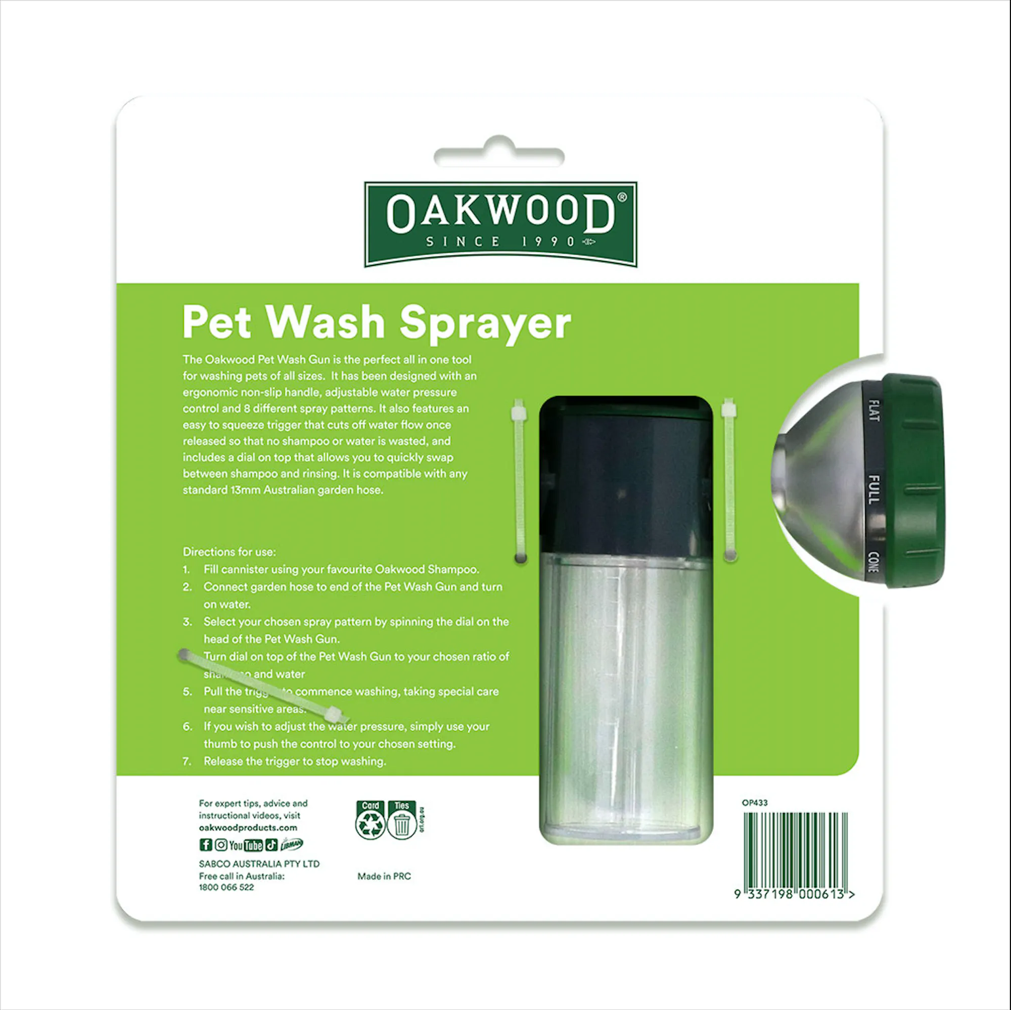 Oakwood Pet Wash Sprayer is the perfect all-in-one tool for washing pets of all sizes. It has been designed with an ergonomic non-slip handle, adjustable water pressure control and 8 different spray patterns. It also features an easy to squeeze trigger that cuts off water flow once released so that no shampoo or water is wasted, and includes a dial on top that allows you to quickly swap between shampoo and rinsing. It is compatible with any standard 13mm Australian garden hose.