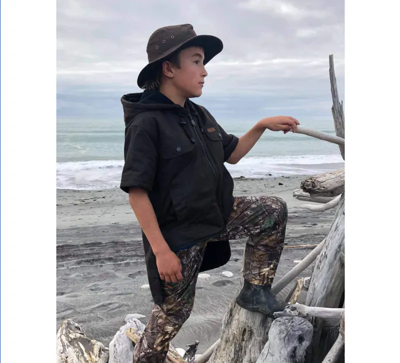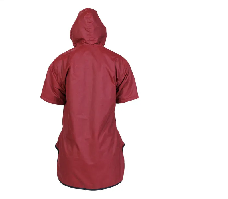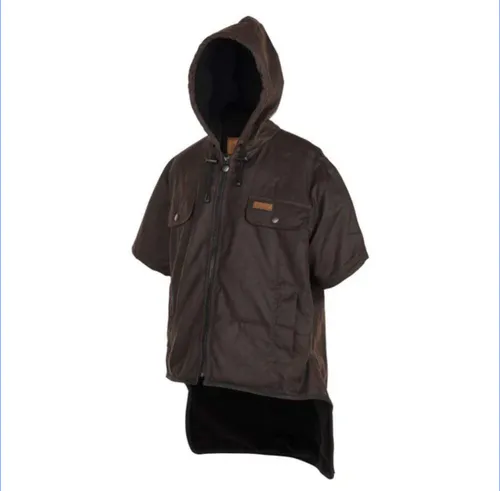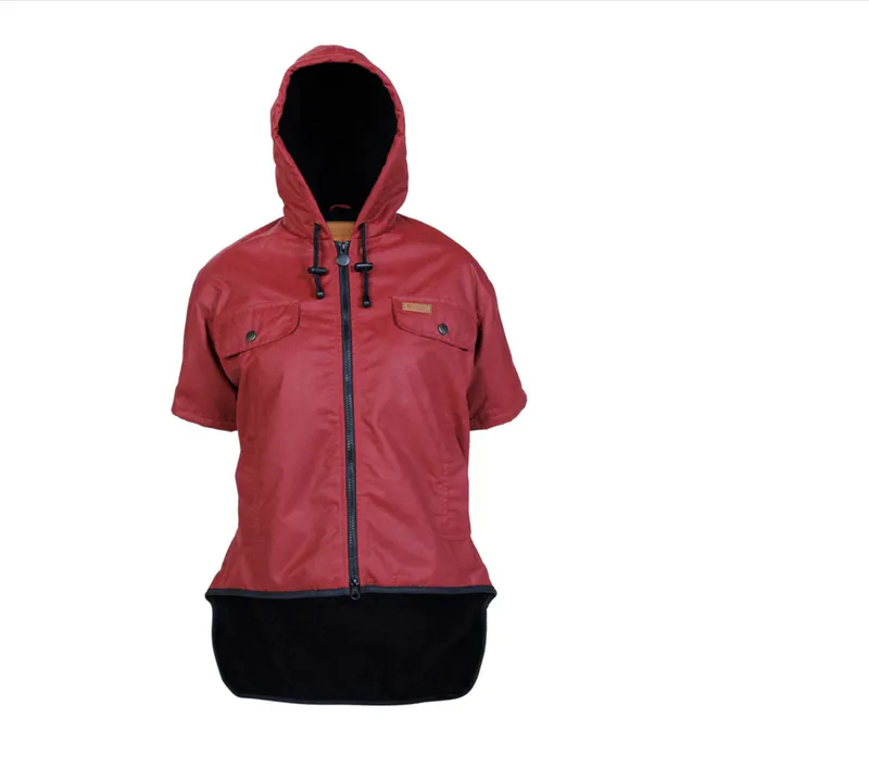1/2 sleeved 12oz oilskin vest features long drop tail, hood with adjustable draw cord, cosy fleece lining, zip closure with internal storm flap, two domed chest pockets, fleece lined side handwarmer pockets...the list is endless!