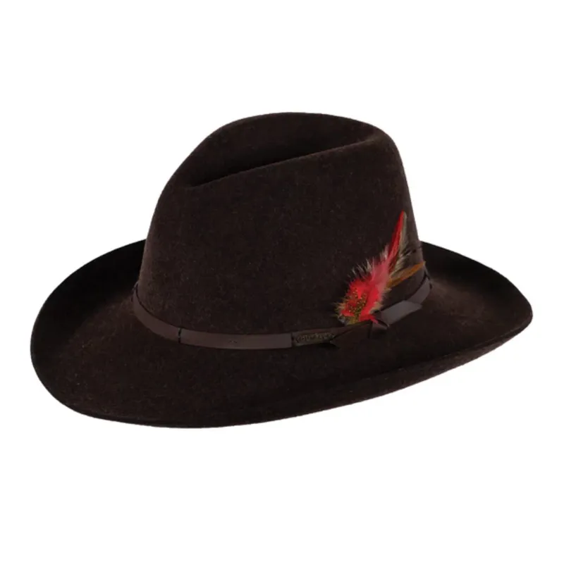 This 100% wool hat is water resistant. Accented with a decorative knotted hat band and an eye-catching feather.