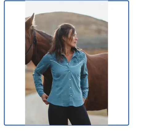 Long sleeved shirt with beautifully embroidered front & back yokes. Snap front opening with modesty snap. Accent piping on western style cuffs & yokes.