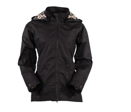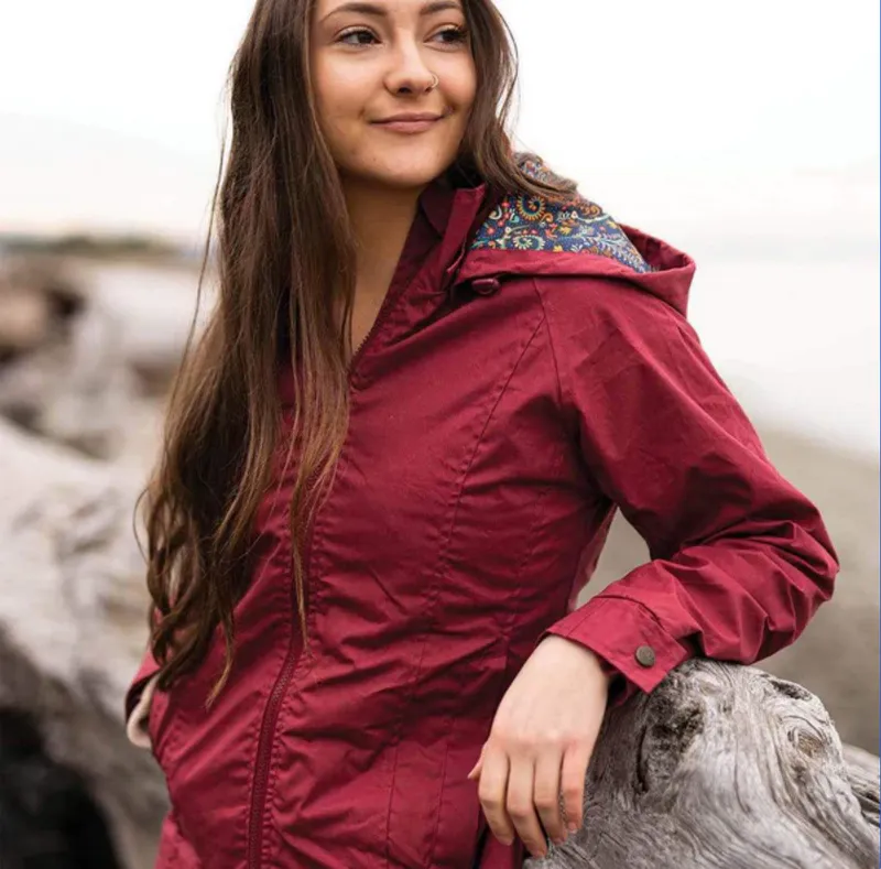 Made from light-weight wax cotton, the Melany Jacket features a dropped hem, snap removable hood, welted zip hip pockets, and a bold and beautiful accent lining.