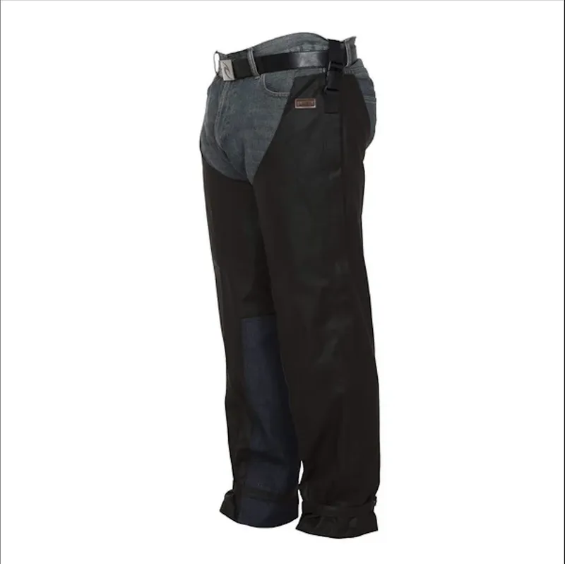 Our unlined Chaps have buckled waist straps that loop around your belt. These have a full-length zipper on each leg and reinforced inserts on inside leg at knee.
