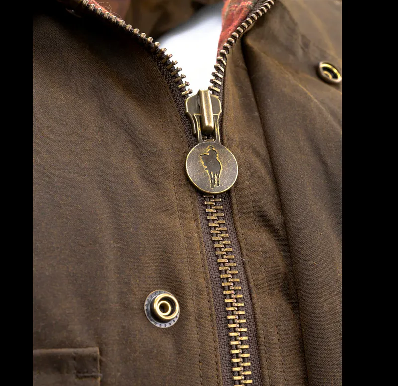 Men's|12oz Oilskin| Brass 2-way Zipper |Storm Flap|Snap Chest Pockets | Side Slits | Dual Entry Hip Pockets | Inside Security Pocket | Yarn Dyed Cotton Lining: Nubuck Leather Collar | Adjustable Back Waist| Waterproof & Breathable.