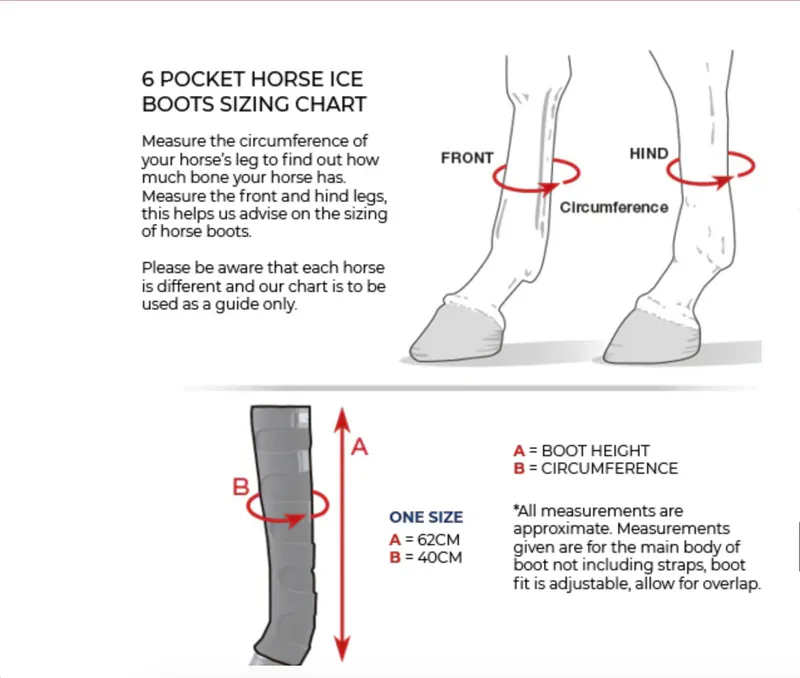 6 pockets sewn onto the inside of the boots can be filled with crushed ice, which will slowly permeate through to the horse’s leg providing ice-cold treatment. These ice boots come up to/ over the knee or hock for maximum coverage and cooling.