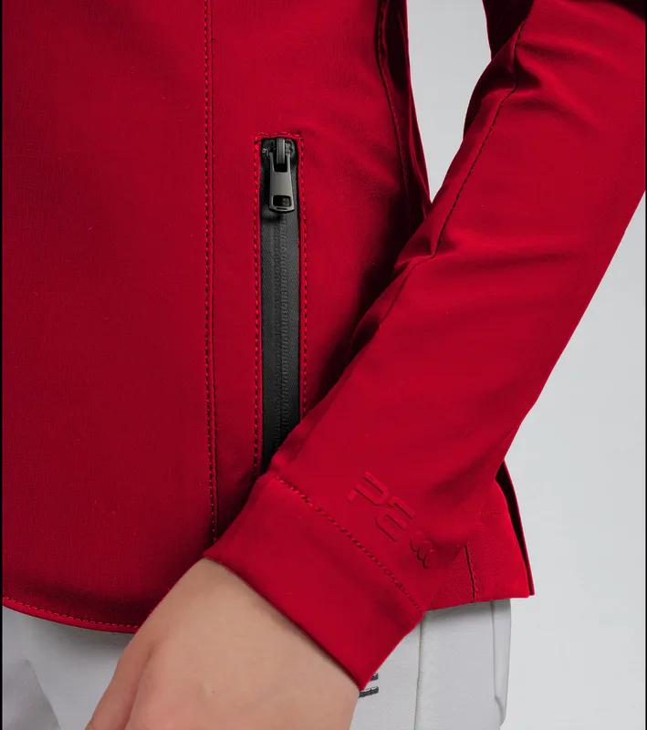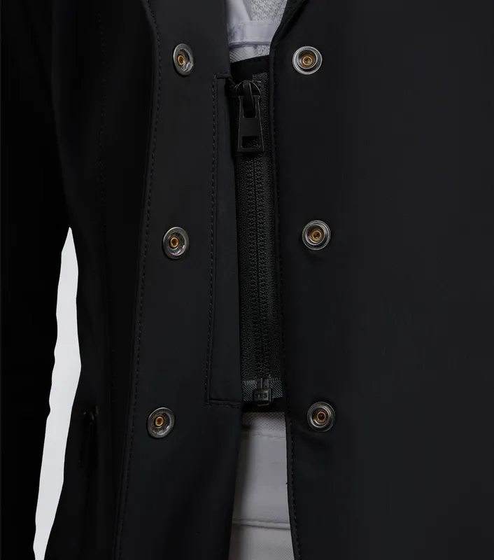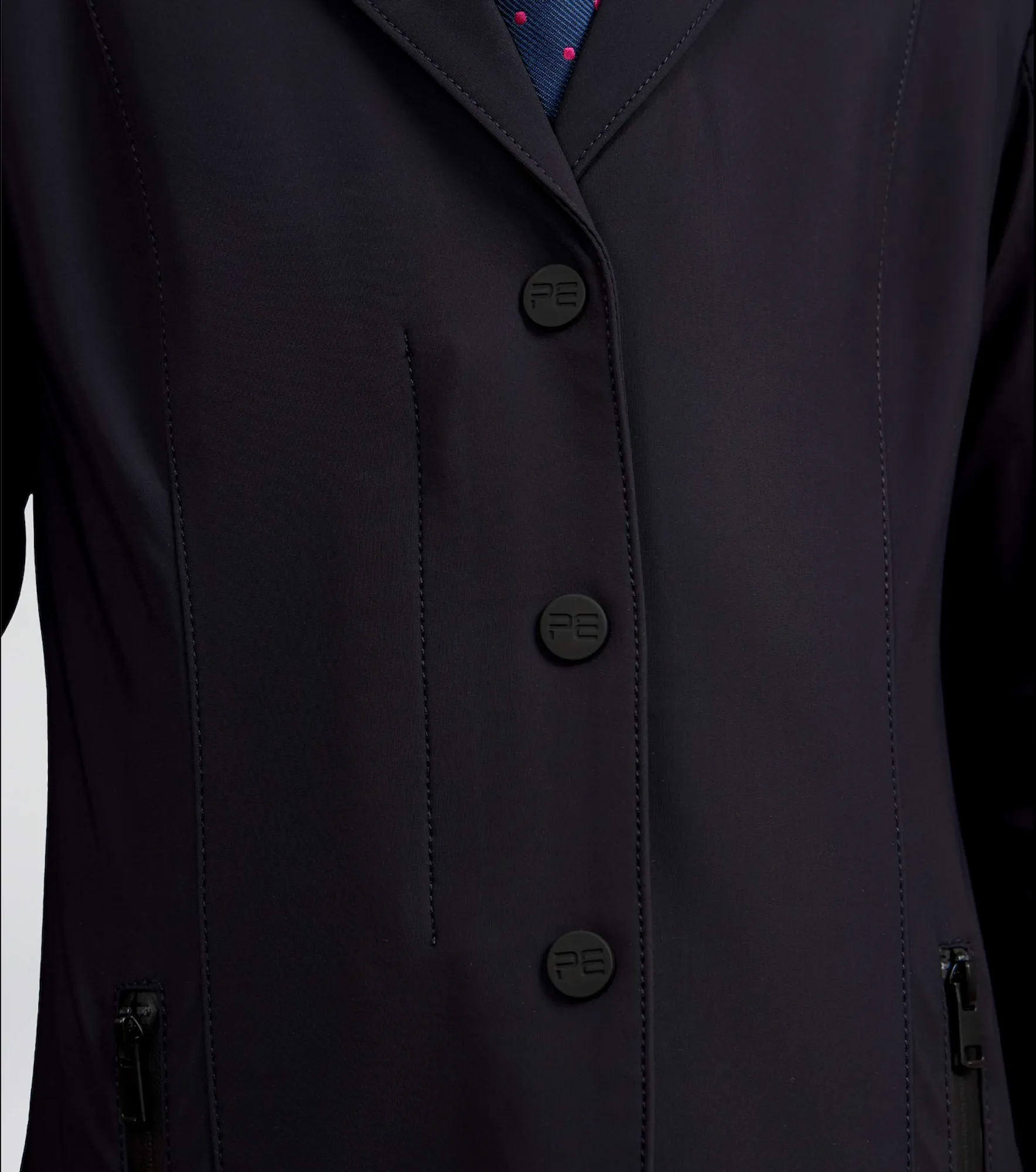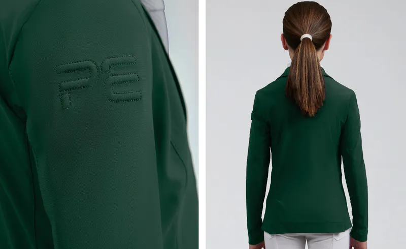 Classically cut, this competition jacket is formed to provide a flattering silhouette, with meticulously placed style lines. A traditional notched lapel collar sits at the top of a YKK zip, concealed by a clean press stud closure. Two pockets offer a place for storing your valuables, with added security provided by the zip closures of a matte finish. The subtle matte styling continues across the finer details of this jacket, including the branded press stud closures and PE branding at the periphery of the cuff. Our signature chrome PE badge is situated on the rider’s left arm, presenting continuity with our existing collection. An embossed PE form is elegantly rested on the rider’s right arm, boasting the quality and functionality of this luxury performance jacket.