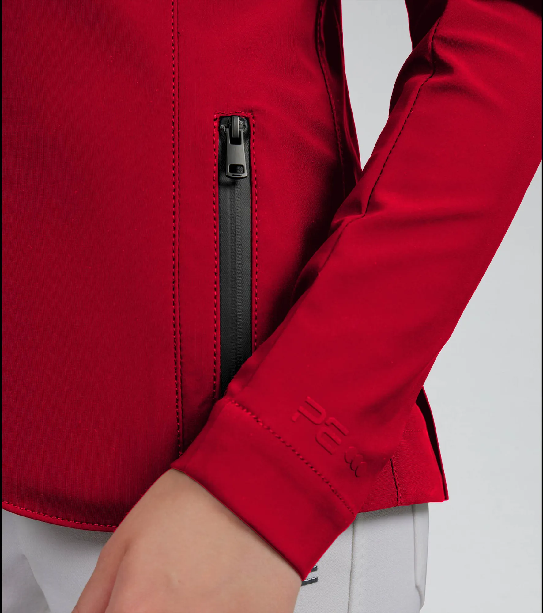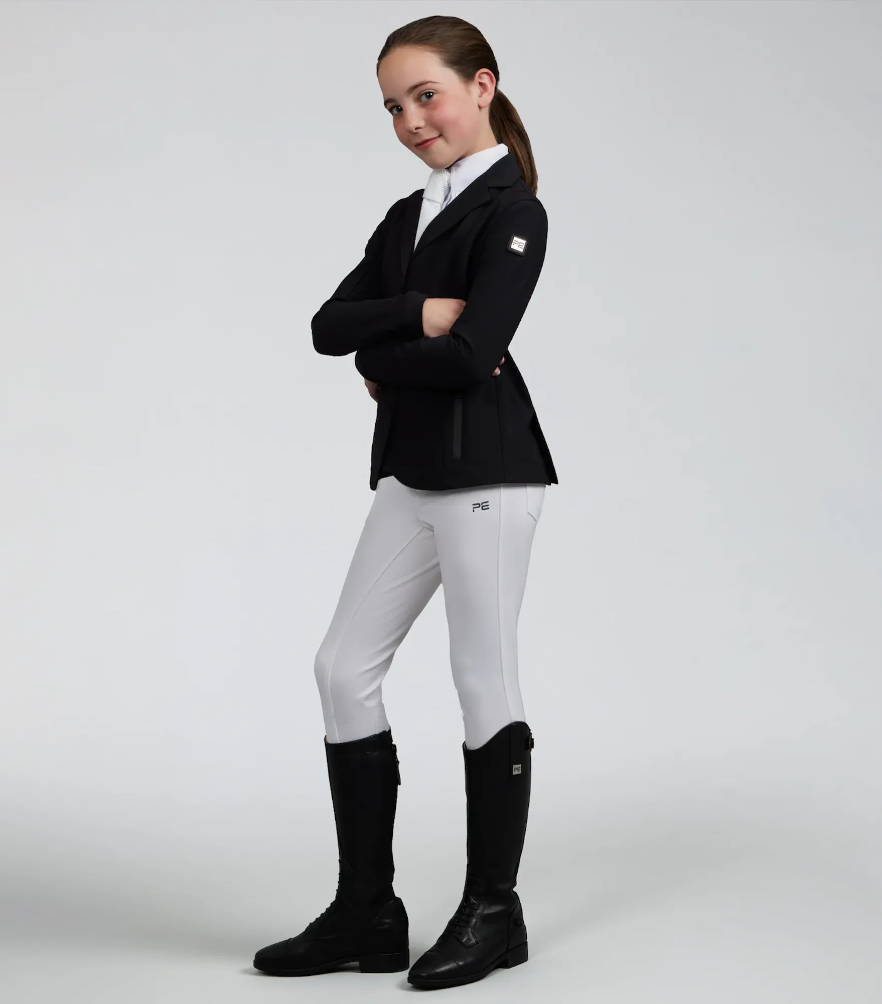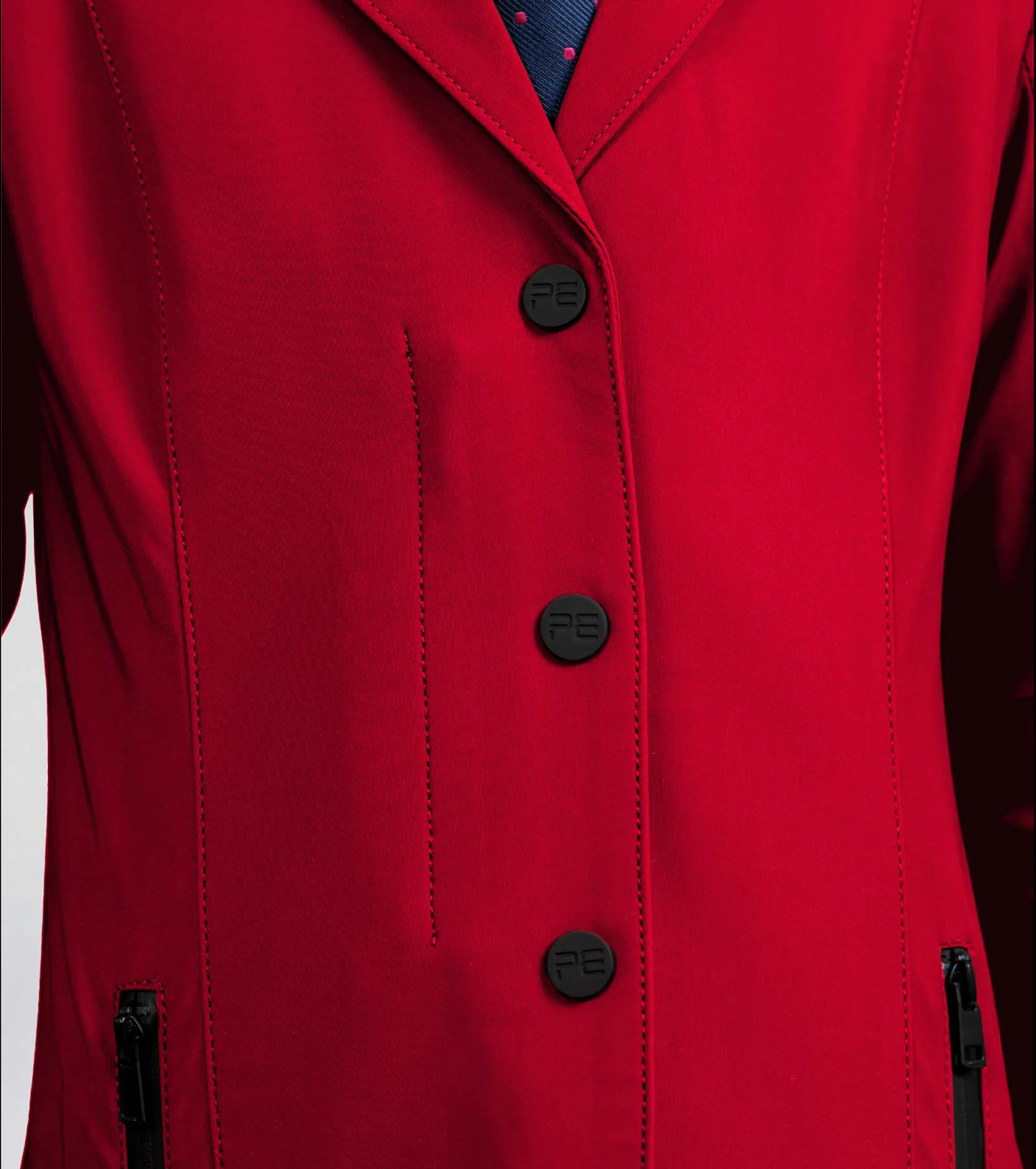 Classically cut, this competition jacket is formed to provide a flattering silhouette, with meticulously placed style lines. A traditional notched lapel collar sits at the top of a YKK zip, concealed by a clean press stud closure. Two pockets offer a place for storing your valuables, with added security provided by the zip closures of a matte finish. The subtle matte styling continues across the finer details of this jacket, including the branded press stud closures and PE branding at the periphery of the cuff. Our signature chrome PE badge is situated on the rider’s left arm, presenting continuity with our existing collection. An embossed PE form is elegantly rested on the rider’s right arm, boasting the quality and functionality of this luxury performance jacket.