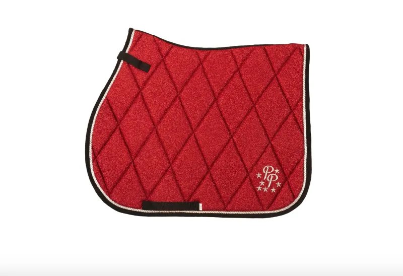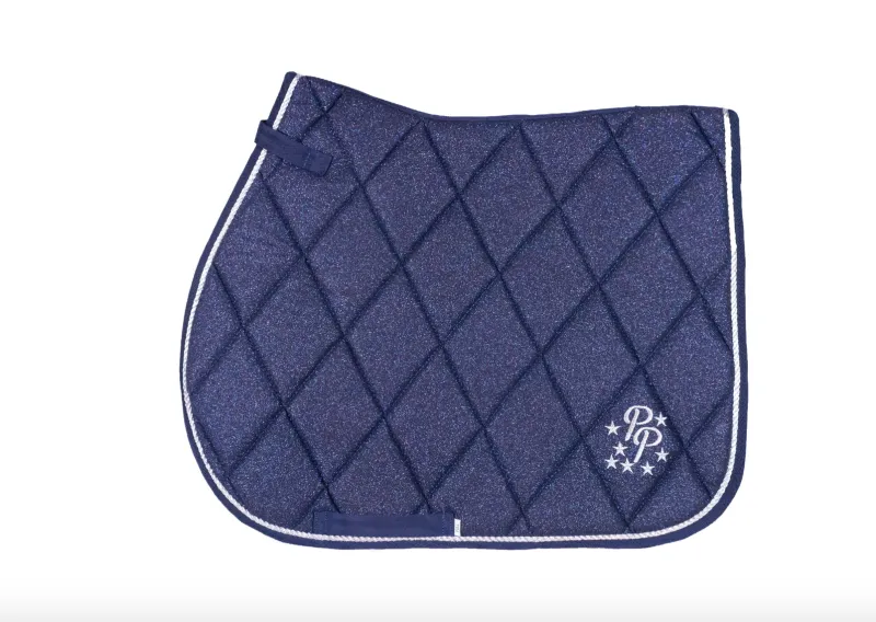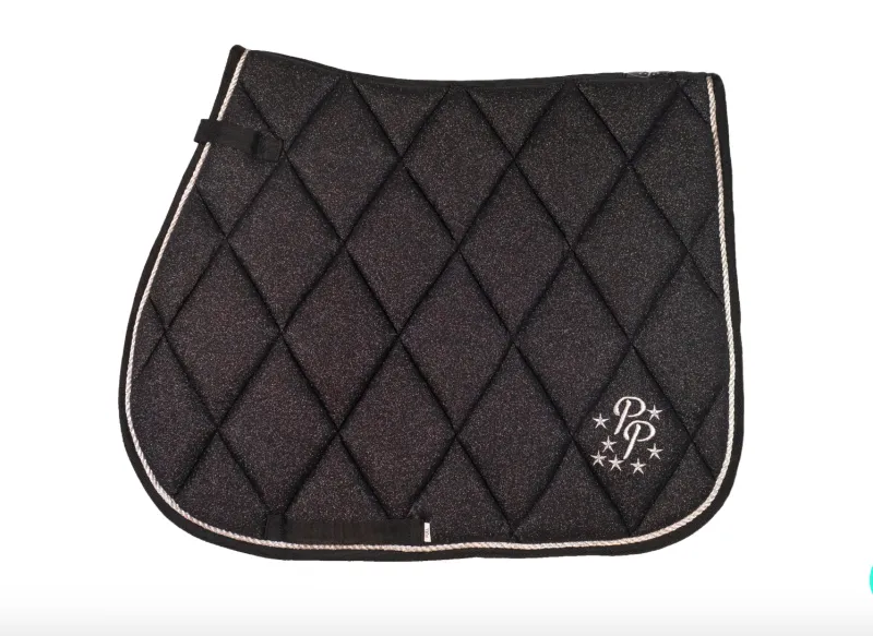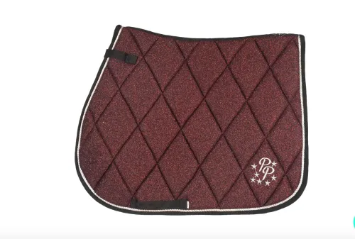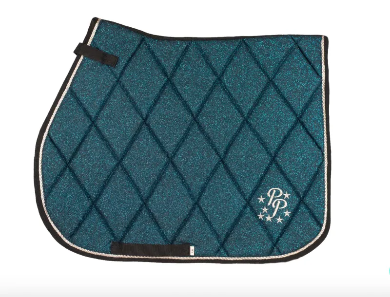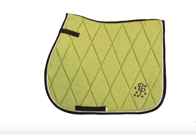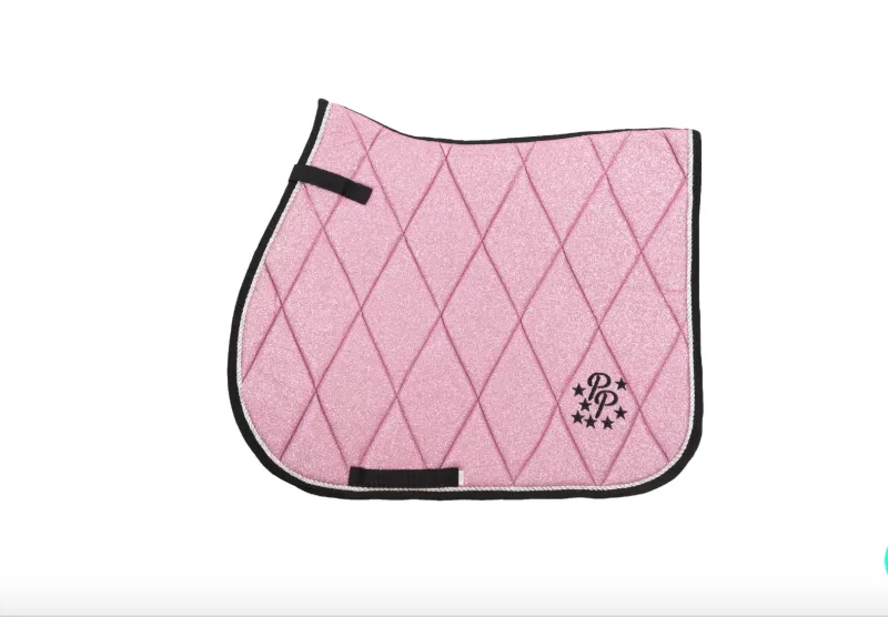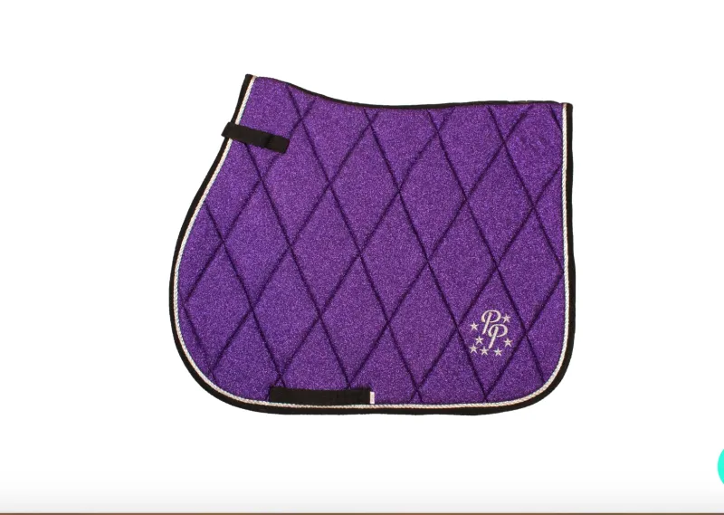 Glittery saddle pad in a wither relief and back relief cut creating a channel for air flow along the back. General/all purpose cut. Made with a sweat wicking underside and 12mm shock absorbing comfort foam. These pads are absolutely stunning in real life, photos just can't capture their sparkle!