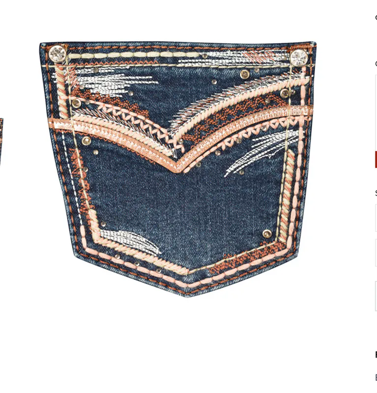 Boot cut, stretch for comfort, mid rise, adjustable elastic waistband on all sizes, logo shank button, diamante rivets, woven logo label on back yoke, feature embroidery on back pockets and front scoop pockets, contrast all over topstitch.