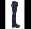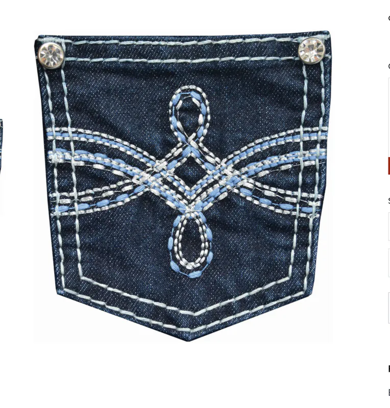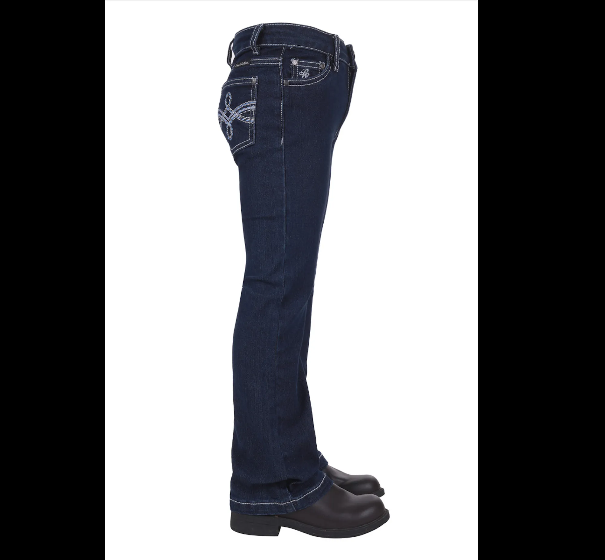 Boot cut, stretch for comfort, mid rise, adjustable elastic waistband on all sizes, logo shank button, diamante rivets, feature embroidery on back pockets, contrast all over topstitch.