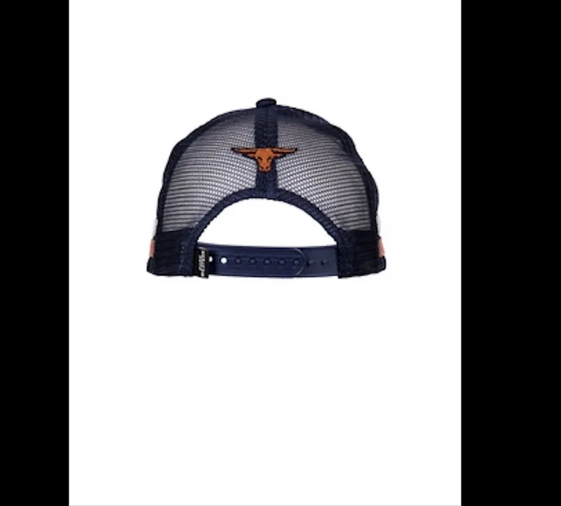 5 panel trucker cap, front multi colour embroidery, peak with multicolour contrast stitching, contrast sandwich peak, contrast crown piping, Pure Western back embroidery.